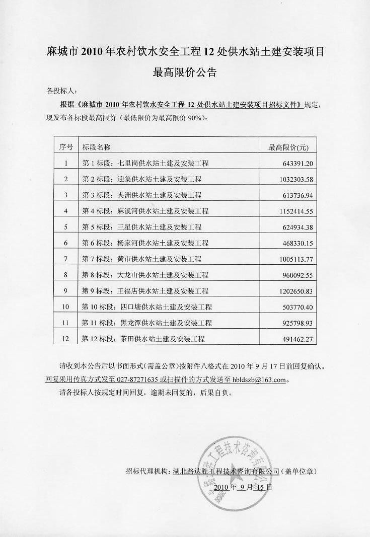 请收到本公告后以书面形式(需盖公章)按附件八格式在2010年9月17日前回复确认。回复采用传真方式发至027-87271635或扫描件的方式发至hbldszb@163.com。请各投标人按规定时间回复,逾期未回复的,后果自负。