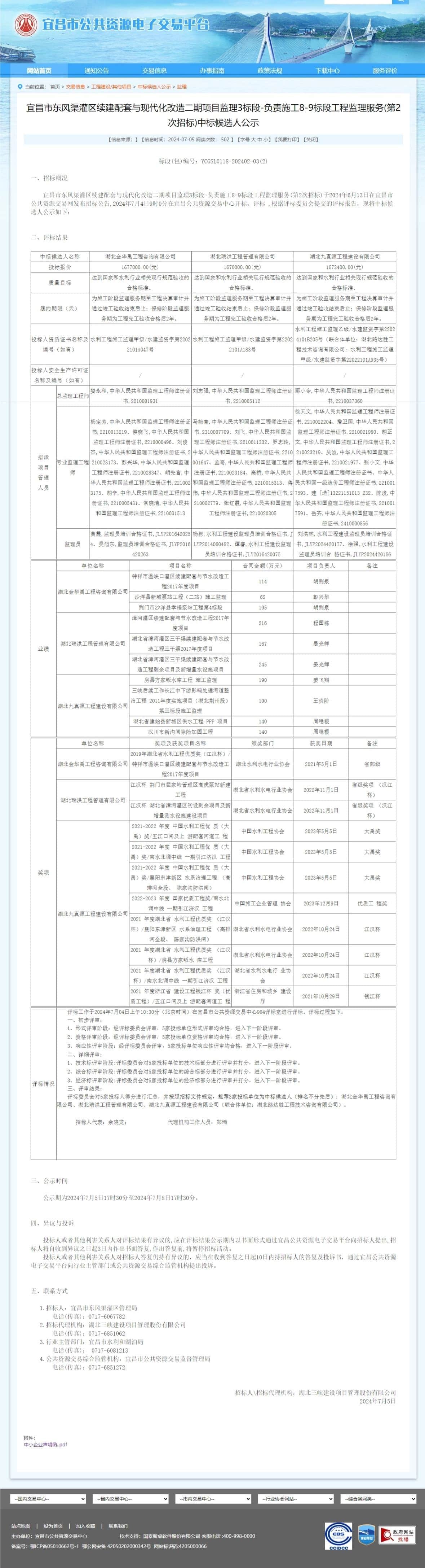宜昌市东风渠灌区续建配套与现代化改造二期项目监理3标段-负责施工8-9标段工程监理服务(第2次招标)于2024年6月13日在宜昌市公共资源交易网发布招标公告,2024年7月4日9时0分在宜昌公共资源交易中心开标、评标 ,根据评标委员会提交的评标报告,现将中标候选人公示如下: