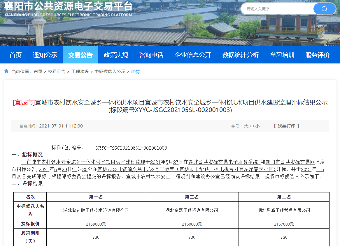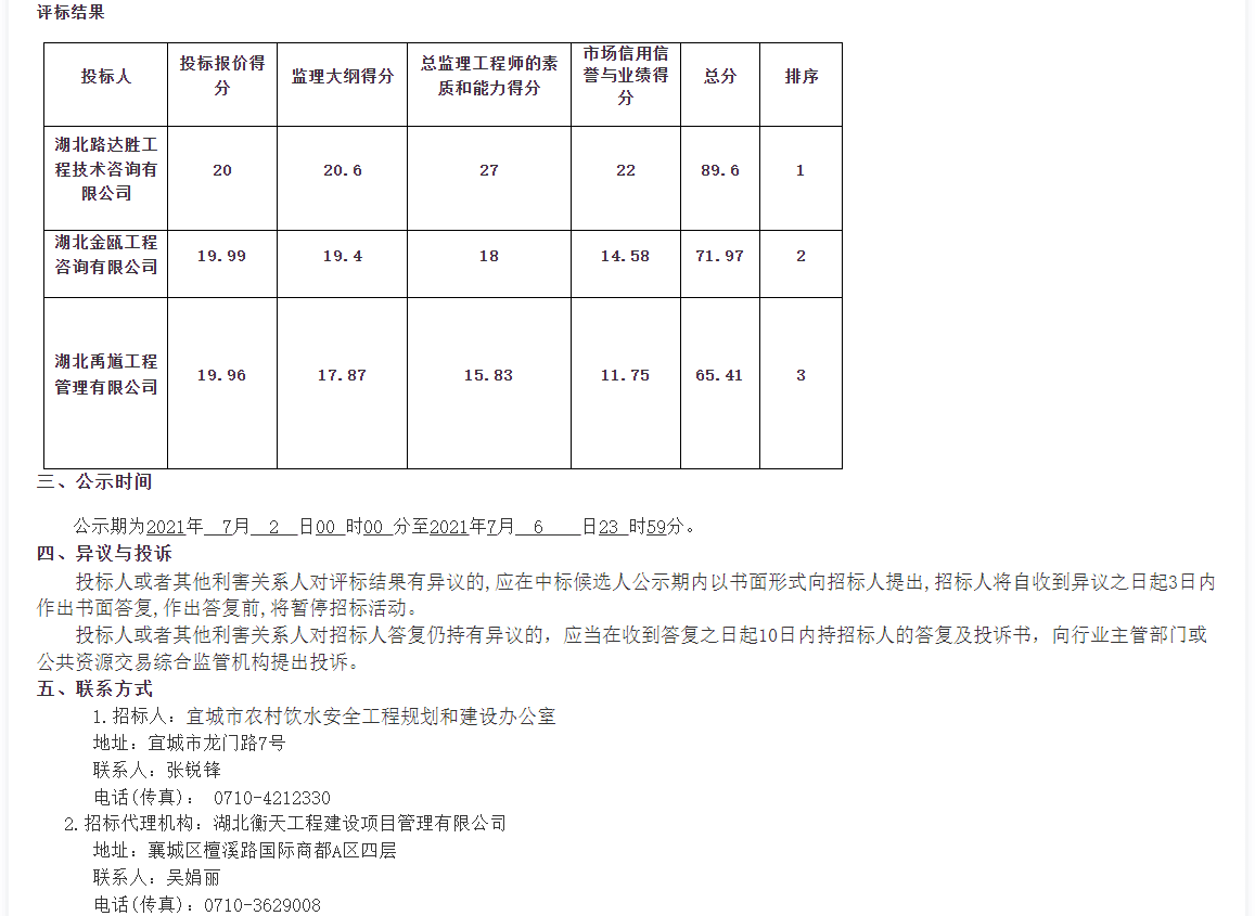 宜城市农村饮水安全城乡一体化供水项目供水建设监理于2021年5月27日在湖北公共资源交易电子服务系统 和襄阳市公共资源交易网上发布招标公告,2021年6月29日9 时30分在宜城市公共资源交易中心2号开标室(宜城市中华路广播电视台对面左岸春天小区)开标,并于2021年 6月29日完成评标 ,根据评标委员会提交的评标报告,宜城市农村饮水安全工程规划和建设办公室已经确认评标结果,现将中标候选人公示如下: