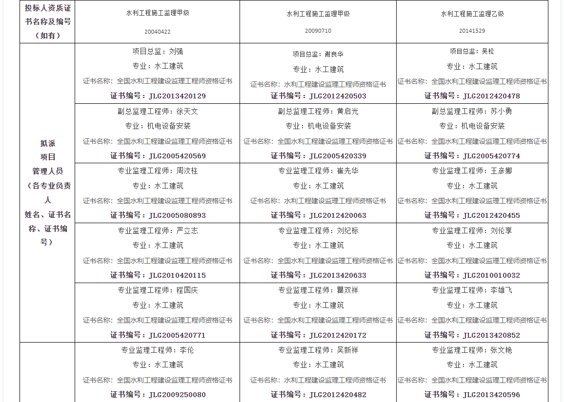 项目总监:刘强 专业:水工建筑 证书名称:全国水利工程建设监理工程师资格证书 证书编号:JLG2013420129 |