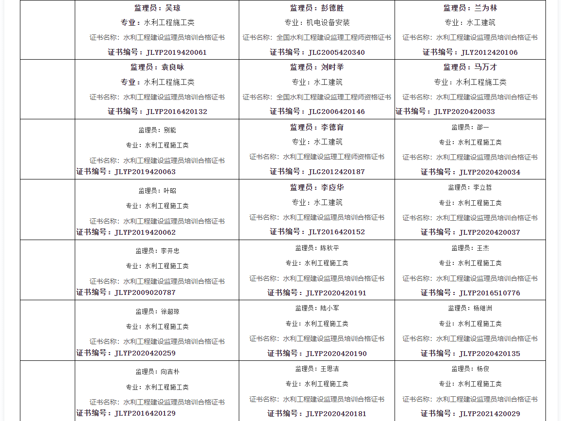 监理员:李立哲 专业:水利工程施工类 证书名称:水利工程建设监理员培训合格证书 证书编号:JLYP2020420037 |