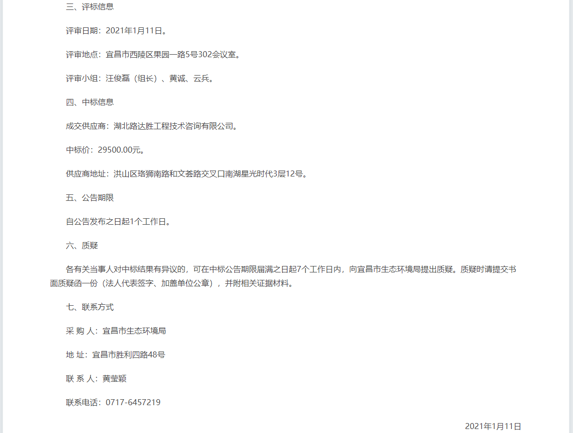 各有关当事人对中标结果有异议的,可在中标公告期限届满之日起7个工作日内,向宜昌市生态环境局提出质疑。质疑时请提交书面质疑函一份(法人代表签字、加盖单位公章),并附相关证据材料。