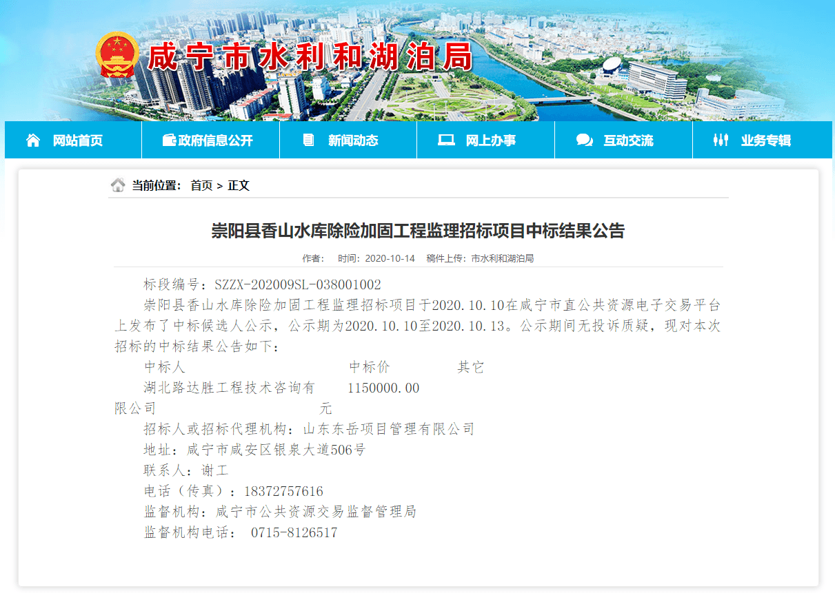 崇阳县香山水库除险加固工程监理招标项目于2020.10.10在咸宁市直公共资源电子交易平台上发布了中标候选人公示,公示期为2020.10.10至2020.10.13。公示期间无投诉质疑,现对本次招标的中标结果公告如下:
