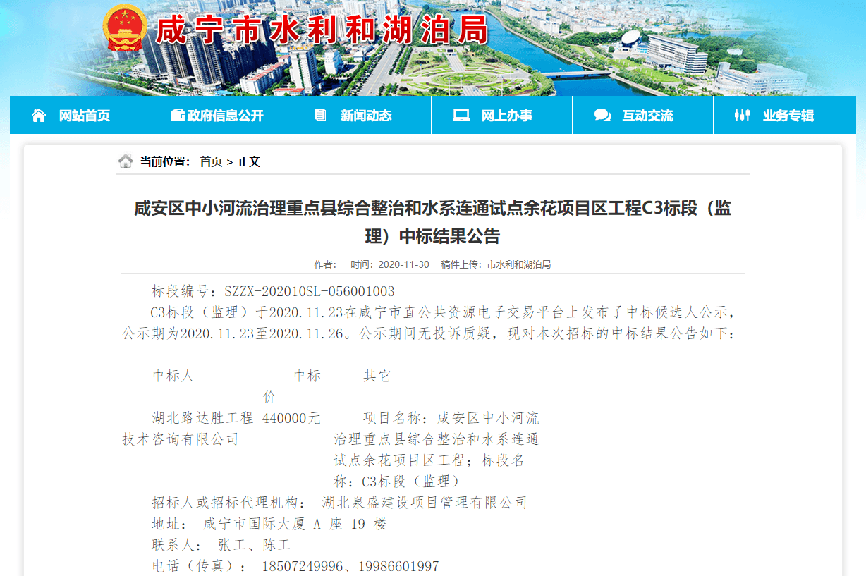 C3标段(监理)于2020.11.23在咸宁市直公共资源电子交易平台上发布了中标候选人公示,公示期为2020.11.23至2020.11.26。公示期间无投诉质疑,现对本次招标的中标结果公告如下: