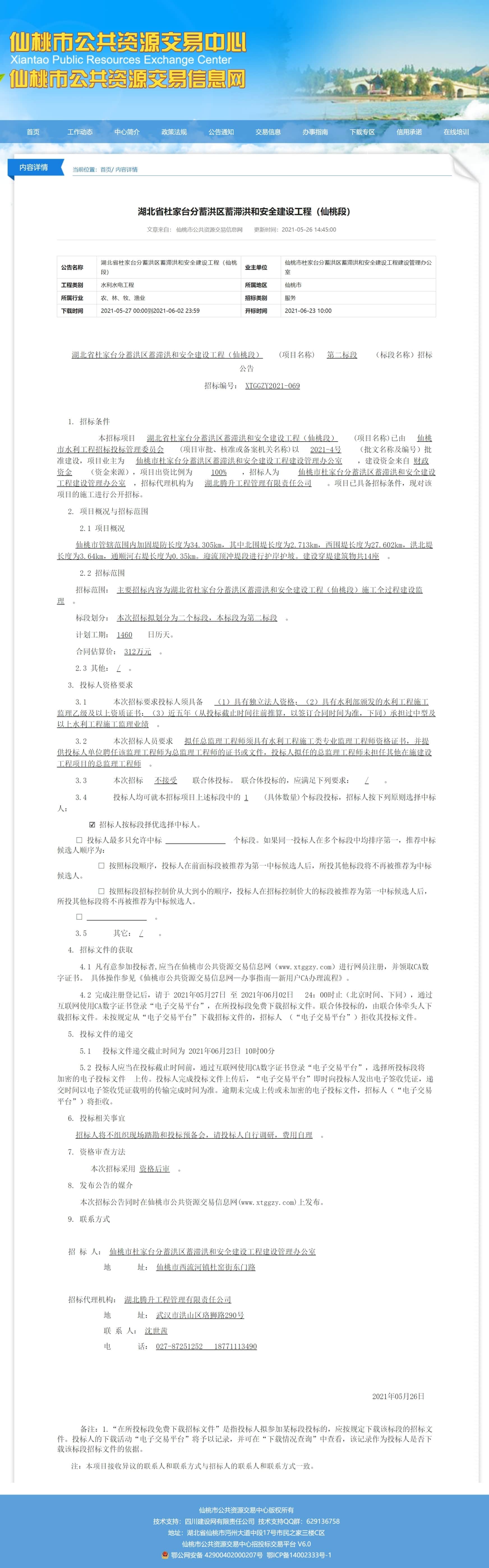 湖北省杜家台分蓄洪区蓄滞洪和安全建设工程(仙桃段) (二标段 )招标公告