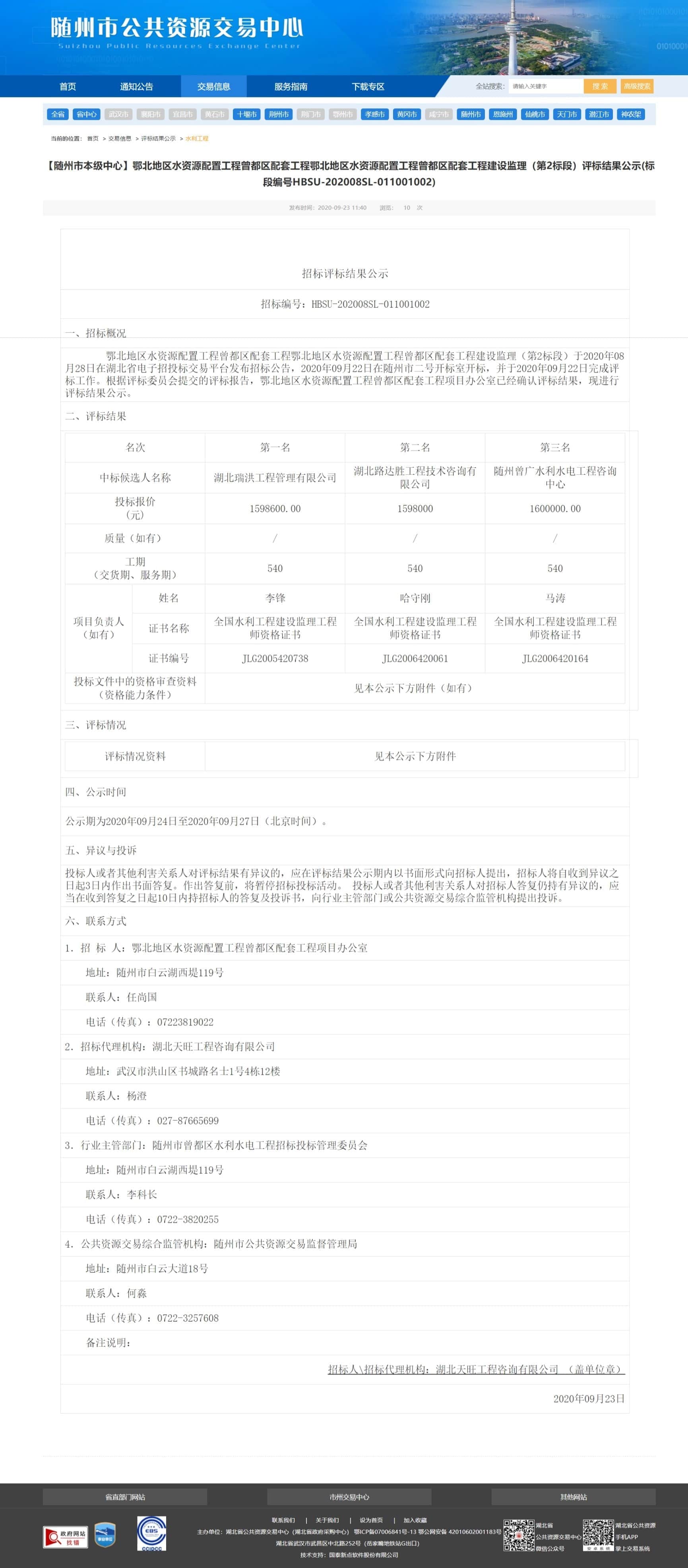 【随州市本级中心】鄂北地区水资源配置工程曾都区配套工程鄂北地区水资源配置工程曾都区配套工程建设监理(第2标段)评标结果公示(标段编号HBSU-202008SL-011001002)