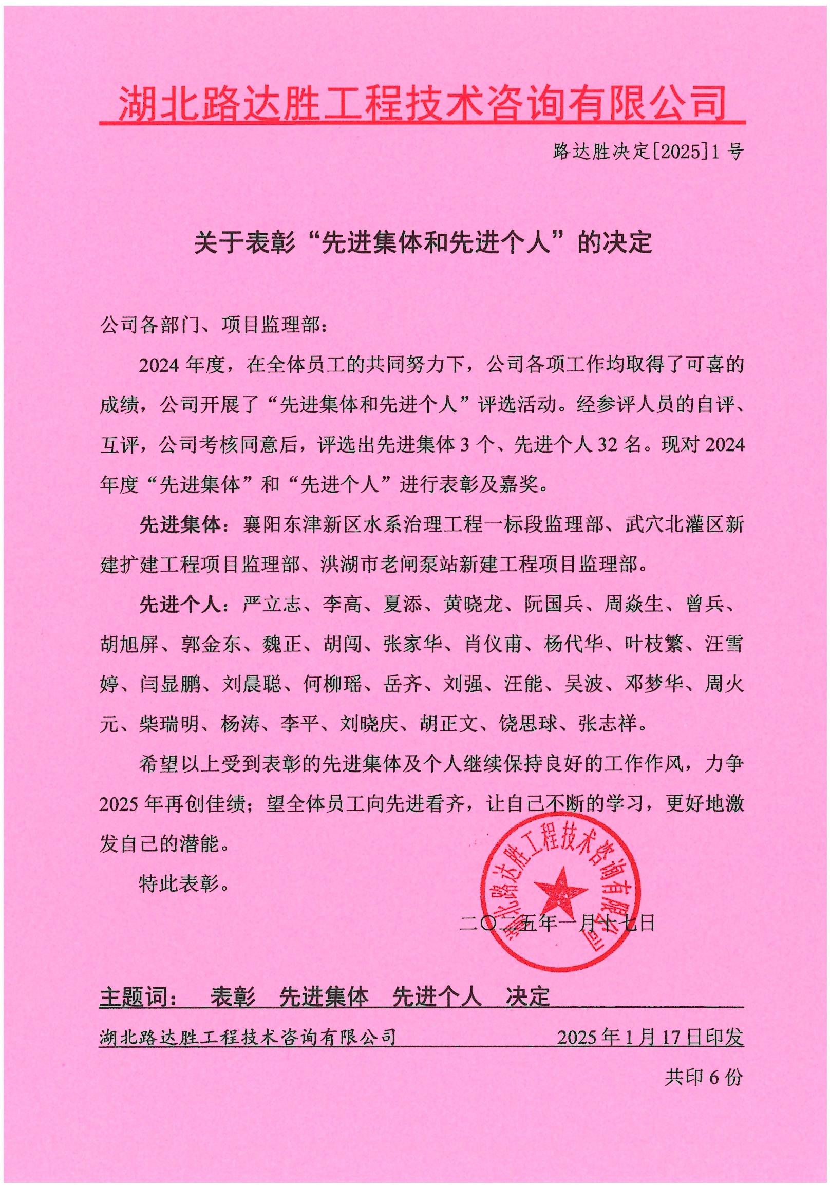2024年度,在全体员工的共同努力下,公司各项工作均取得了可喜的成绩,公司开展了“先进集体和先进个人”评选活动。经参评人员的自评、互评,公司考核同意后,评选出先进集体3个、先进个人32名。现对2024年度“先进集体”和“先进个人”进行表彰及嘉奖。