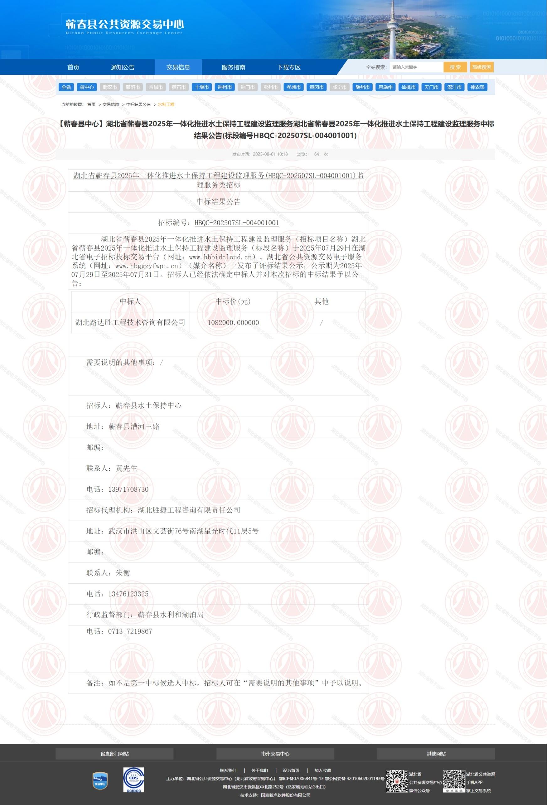 【蕲春县中心】湖北省蕲春县2025年一体化推进水土保持工程建设监理服务湖北省蕲春县2025年一体化推进水土保持工程建设监理服务中标结果公告(标段编号HBQC-202507SL-004001001)