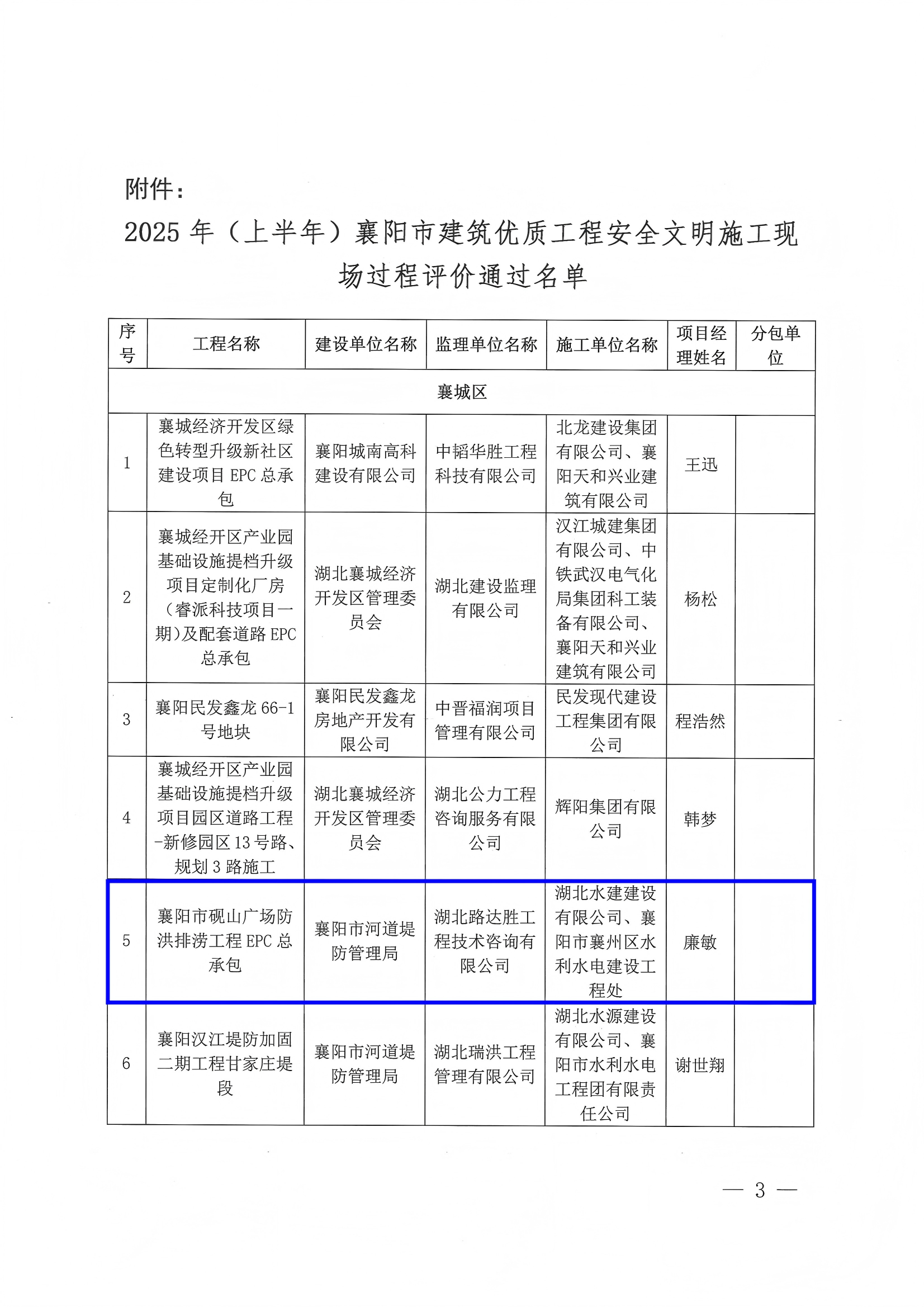 关于2025年度(上半年)襄阳市建筑优质工程安全文明施工现场过程评价结果的通报
