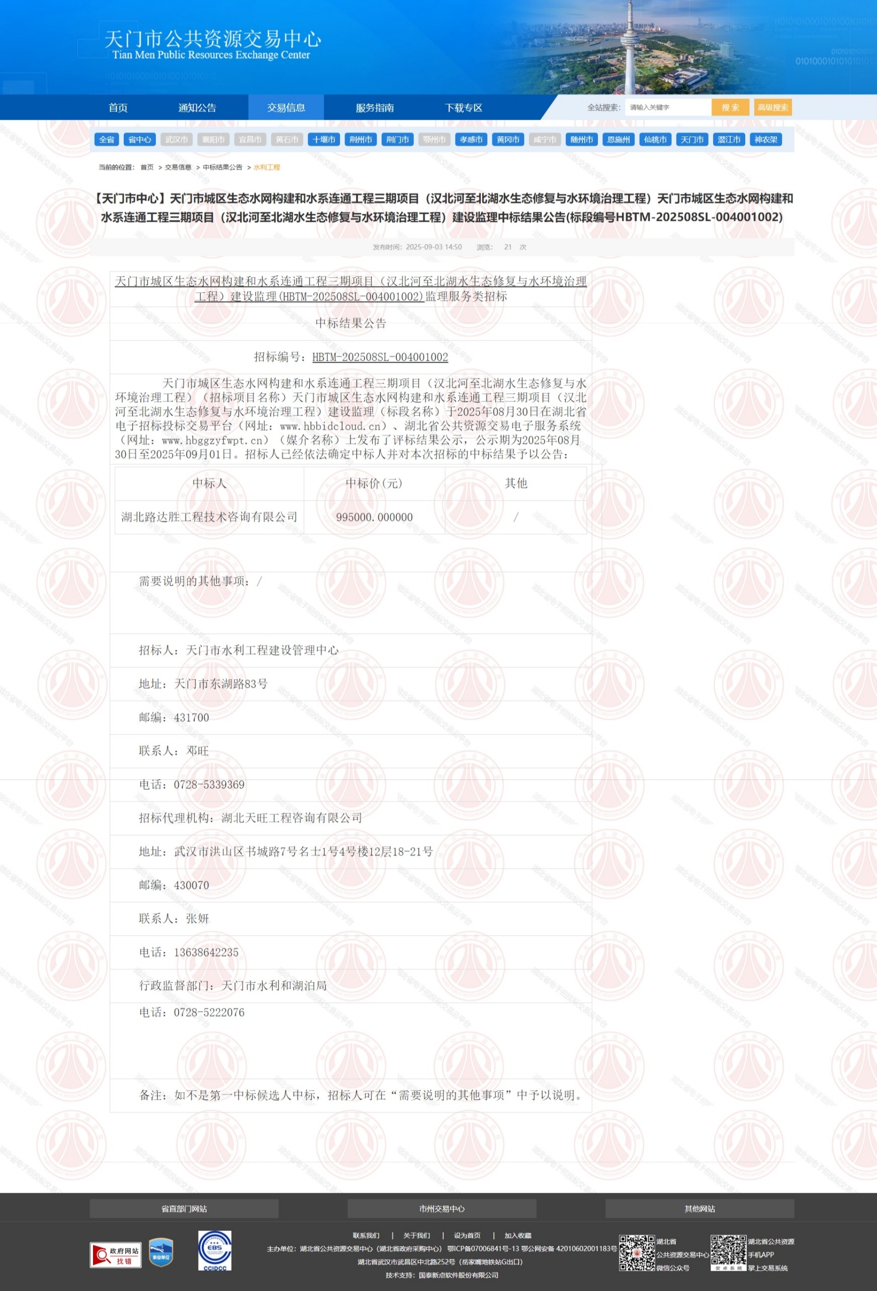 天门市城区生态水网构建和水系连通工程三期项目(汉北河至北湖水生态修复与水环境治理工程)(招标项目名称)天门市城区生态水网构建和水系连通工程三期项目(汉北河至北湖水生态修复与水环境治理工程)建设监理(标段名称)于2025年08月30日在湖北省电子招标投标交易平台(网址:www.hbbidcloud.cn)、湖北省公共资源交易电子服务系统(网址:www.hbggzyfwpt.cn)(媒介名称)上发布了评标结果公示,公示期为2025年08月30日至2025年09月01日。招标人已经依法确定中标人并对本次招标的中标结果予以公告: