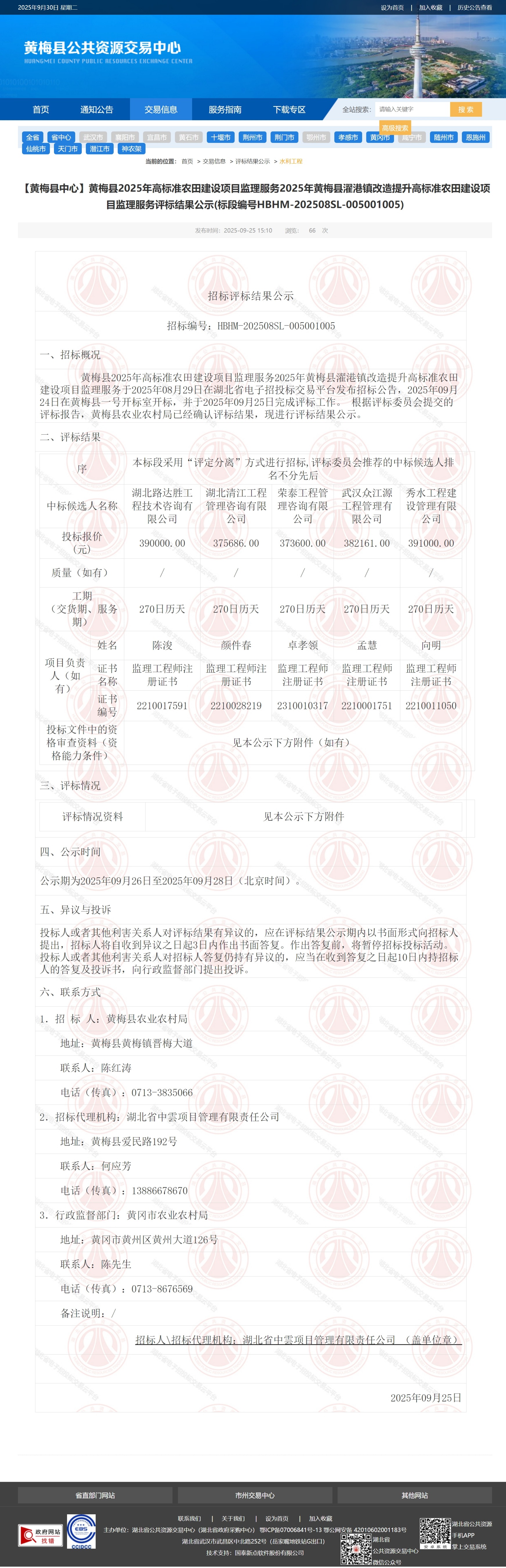 黄梅县2025年高标准农田建设项目监理服务2025年黄梅县濯港镇改造提升高标准农田建设项目监理服务于2025年08月29日在湖北省电子招投标交易平台发布招标公告,2025年09月24日在黄梅县一号开标室开标,并于2025年09月25日完成评标工作。 根据评标委员会提交的评标报告,黄梅县农业农村局已经确认评标结果,现进行评标结果公示。