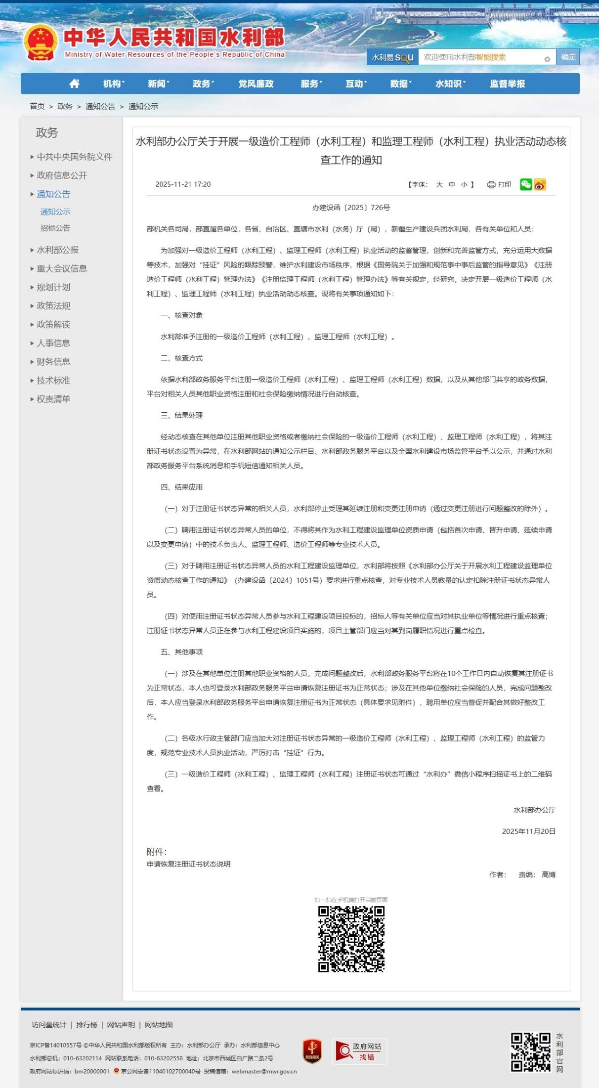 (三)一级造价工程师(水利工程)、监理工程师(水利工程)注册证书状态可通过“水利办”微信小程序扫描证书上的二维码查看。