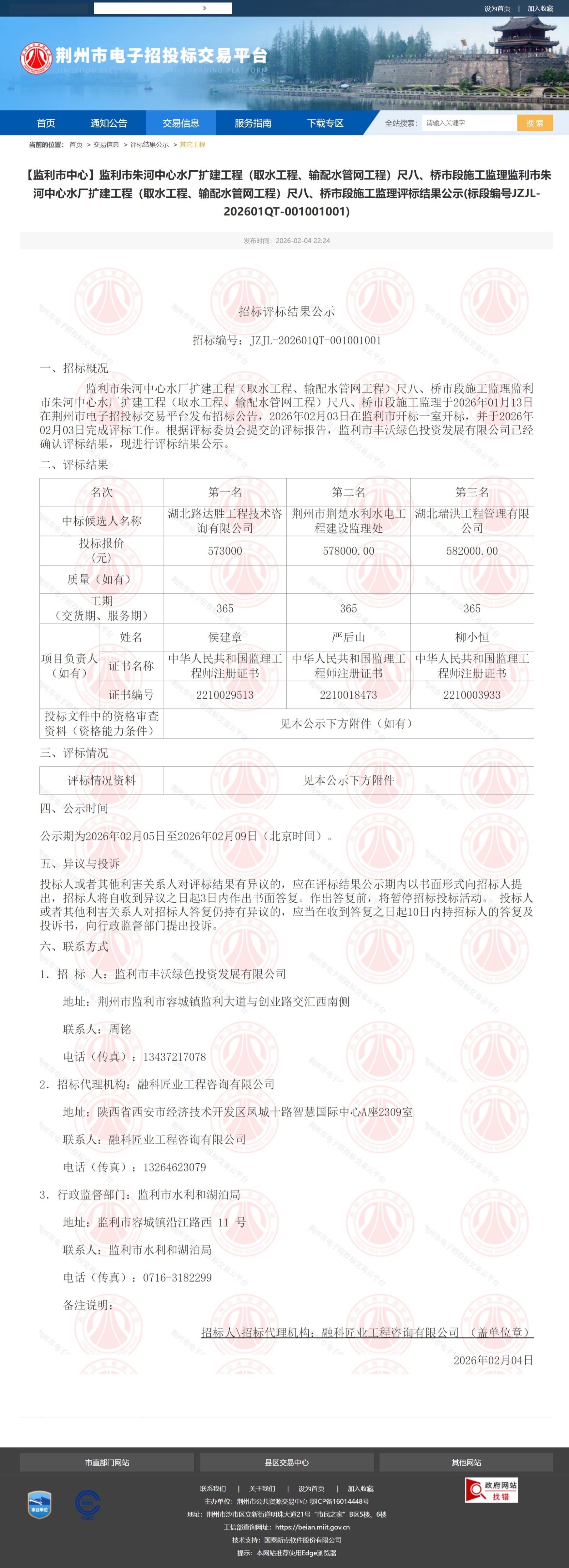监利市朱河中心水厂扩建工程(取水工程、输配水管网工程)尺八、桥市段施工监理监利市朱河中心水厂扩建工程(取水工程、输配水管网工程)尺八、桥市段施工监理于2026年01月13日在荆州市电子招投标交易平台发布招标公告,2026年02月03日在监利市开标一室开标,并于2026年02月03日完成评标工作。根据评标委员会提交的评标报告,监利市丰沃绿色投资发展有限公司已经确认评标结果,现进行评标结果公示。