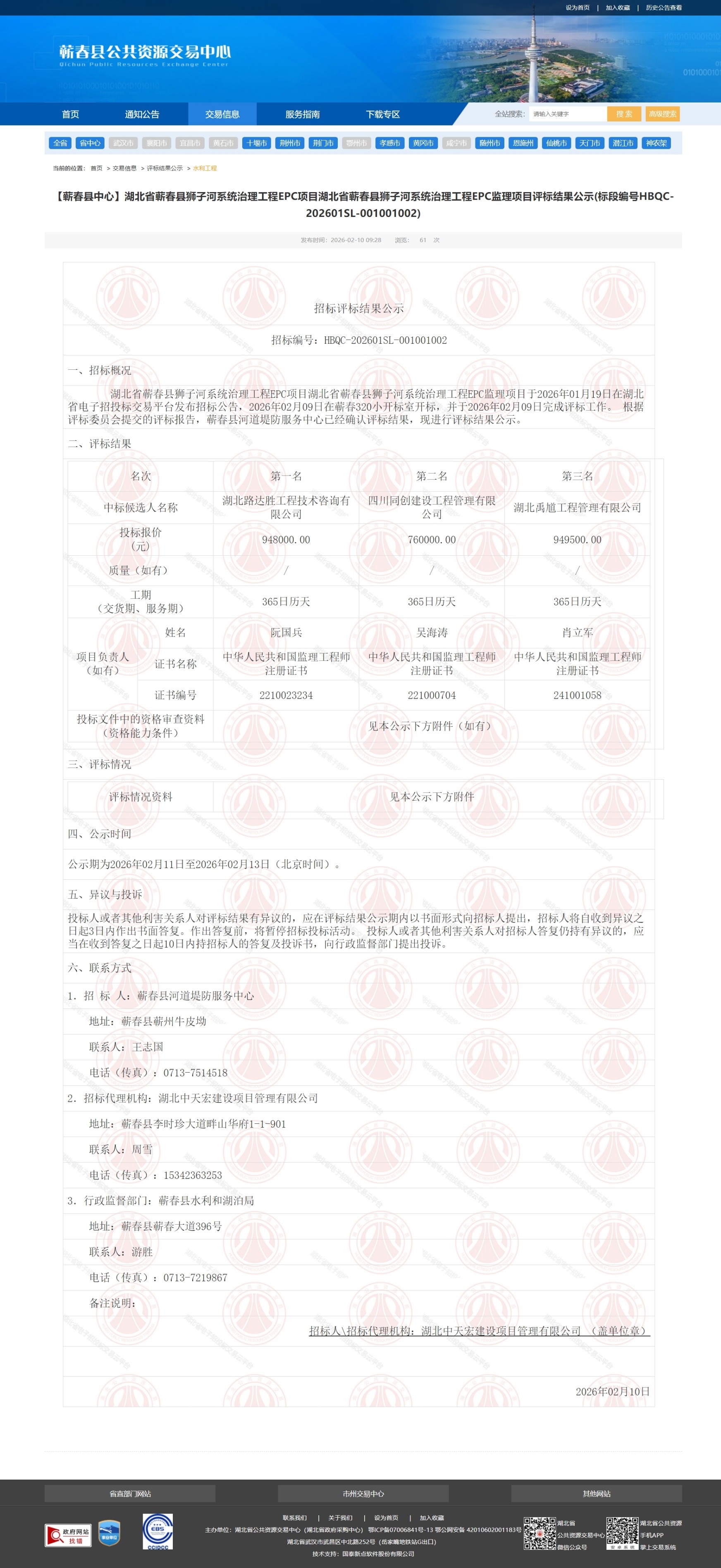 湖北省蕲春县狮子河系统治理工程EPC项目湖北省蕲春县狮子河系统治理工程EPC监理项目于2026年01月19日在湖北省电子招投标交易平台发布招标公告,2026年02月09日在蕲春320小开标室开标,并于2026年02月09日完成评标工作。 根据评标委员会提交的评标报告,蕲春县河道堤防服务中心已经确认评标结果,现进行评标结果公示。