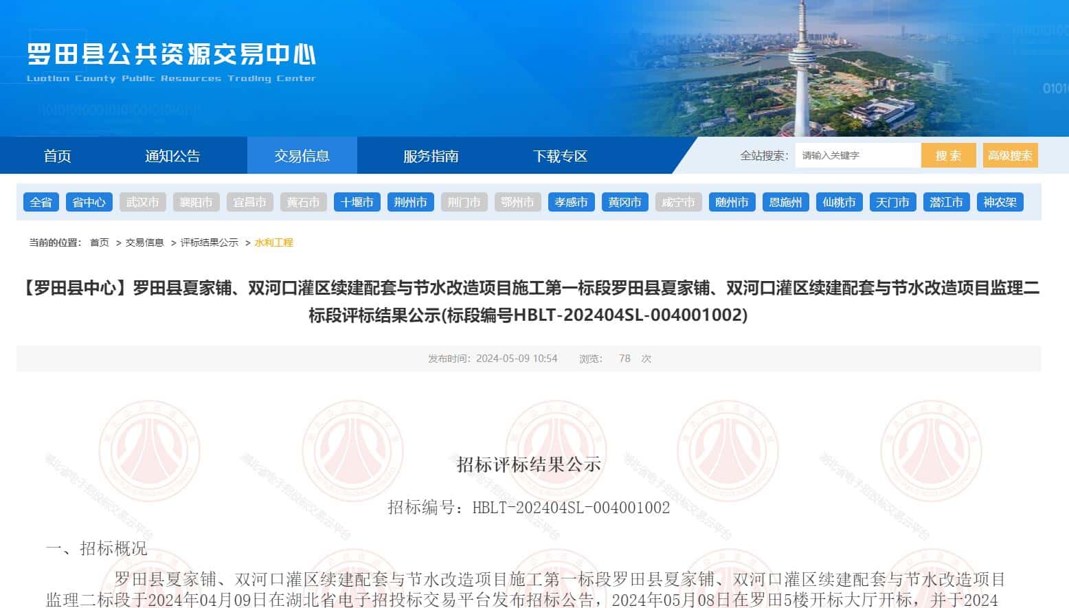 罗田县夏家铺、双河口灌区续建配套与节水改造项目施工第一标段罗田县夏家铺、双河口灌区续建配套与节水改造项目监理二标段于2024年04月09日在湖北省电子招投标交易平台发布招标公告,2024年05月08日在罗田5楼开标大厅开标,并于2024年05月09日完成评标工作。根据评标委员会提交的评标报告,罗田县水电项目建设管理中心已经确认评标结果,现进行评标结果公示。