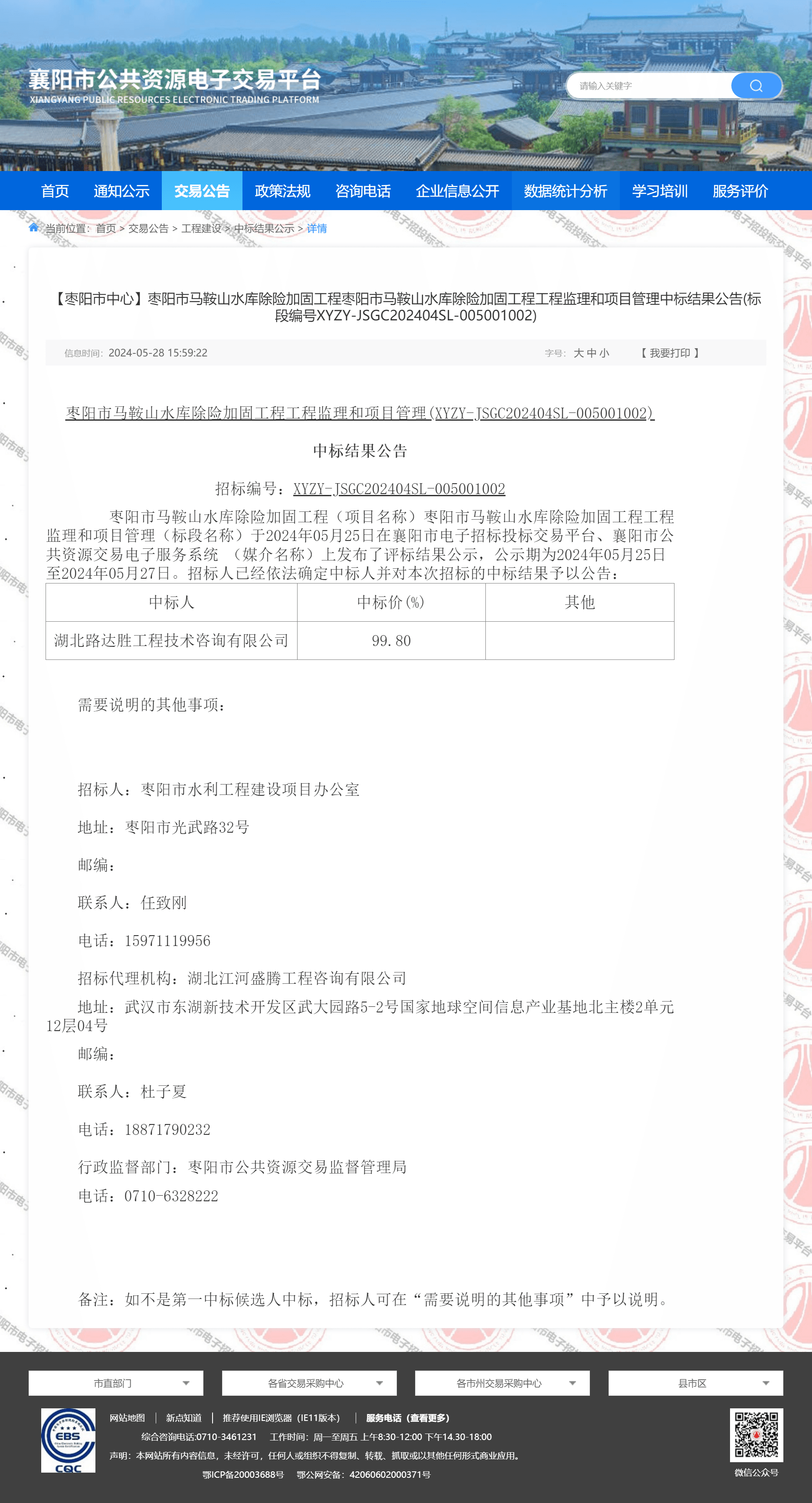 枣阳市马鞍山水库除险加固工程(项目名称)枣阳市马鞍山水库除险加固工程工程监理和项目管理(标段名称)于2024年05月25日在襄阳市电子招标投标交易平台、襄阳市公共资源交易电子服务系统 (媒介名称)上发布了评标结果公示,公示期为2024年05月25日至2024年05月27日。招标人已经依法确定中标人并对本次招标的中标结果予以公告: