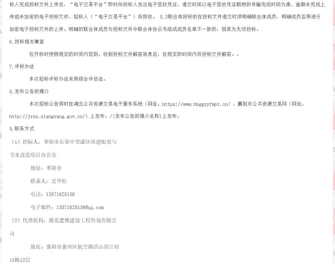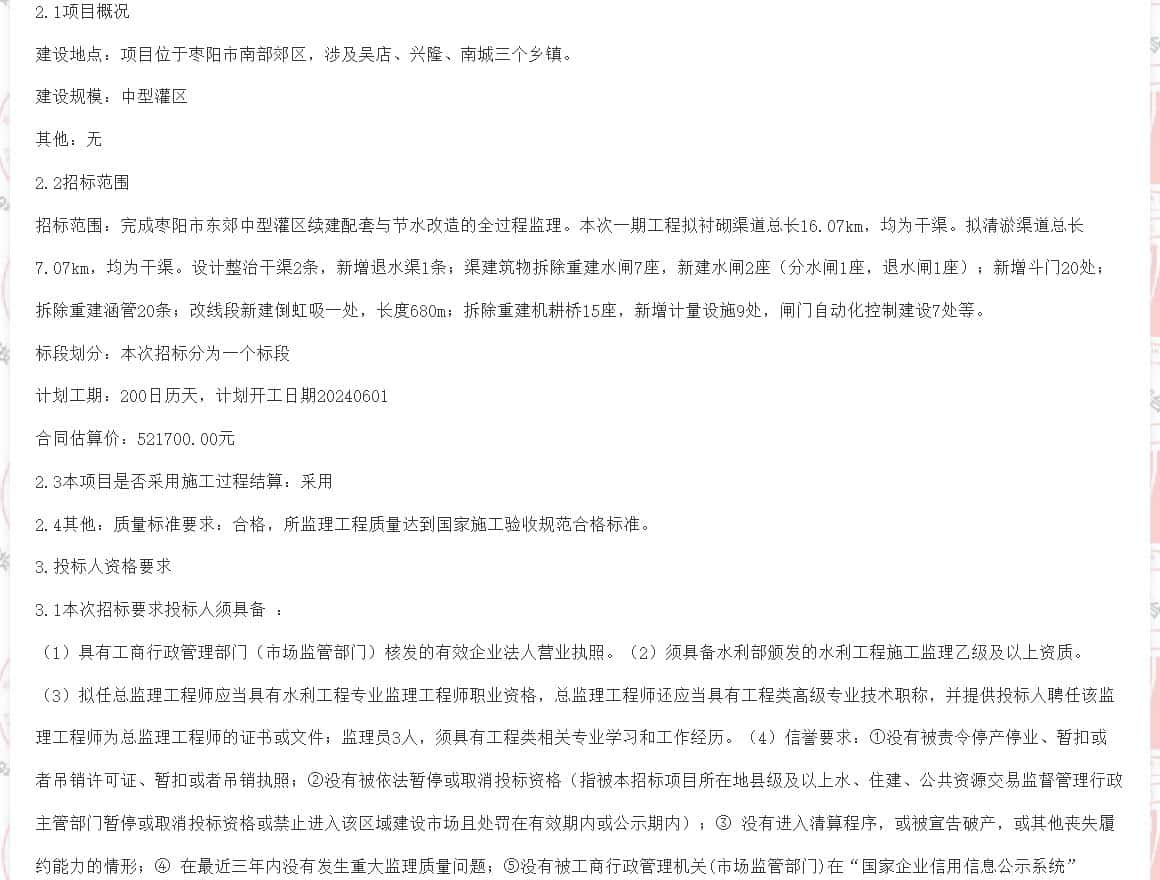 | 本招标项目枣阳市东郊中型灌区续建配套与节水改造EPC总承包项目已由襄阳市发展和改革委员会以襄发改审批【2024】138号批准建设,项目业主为枣阳市东郊中型灌区续建配套与节水改造项目办公室,建设资金来自国债资金及地方配套。项目出资比例为政府投资:100.0%招标人为枣阳市东郊中型灌区续建配套与节水改造项目办公室,招标代理机构为湖北楚鹰建设工程咨询有限公司。项目已具备招标条件,现对该项目施工监理进行公开招标。 | ||||||||||||||||