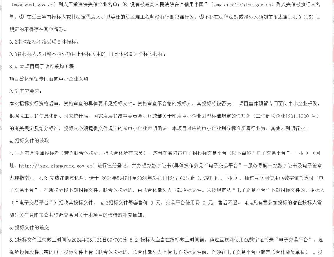 | 4.1 凡有意参加投标者(若为联合体投标,指联合体所有成员),应当在襄阳市电子招投标交易平台(以下简称“电子交易平台”,下同)(网址:http://jyzx.xiangyang.gov.cn)进行注册登记,并办理CA数字证书(具体操作参见“电子交易平台”—服务导航—CA数字证书及电子签章办理指南)。 4.2 完成注册登记后,请于 2024年5月7日至2024年5月11日24:00时止(北京时间、下同),通过互联网使用CA数字证书登录“电子交易平台”,在所投标段下载招标文件。联合体投标的,由联合体牵头人下载招标文件。未按规定从“电子交易平台”下载招标文件的,招标人(“电子交易平台”)拒收其投标文件。 4.3招标文件每套售价 0 元,交易平台使用费 0 元,售后不退。 4.4凡有意参加投标的潜在投标人需随时关注襄阳市公共资源交易网关于本项目的澄清或补充通知。 | ||||||||||||||||