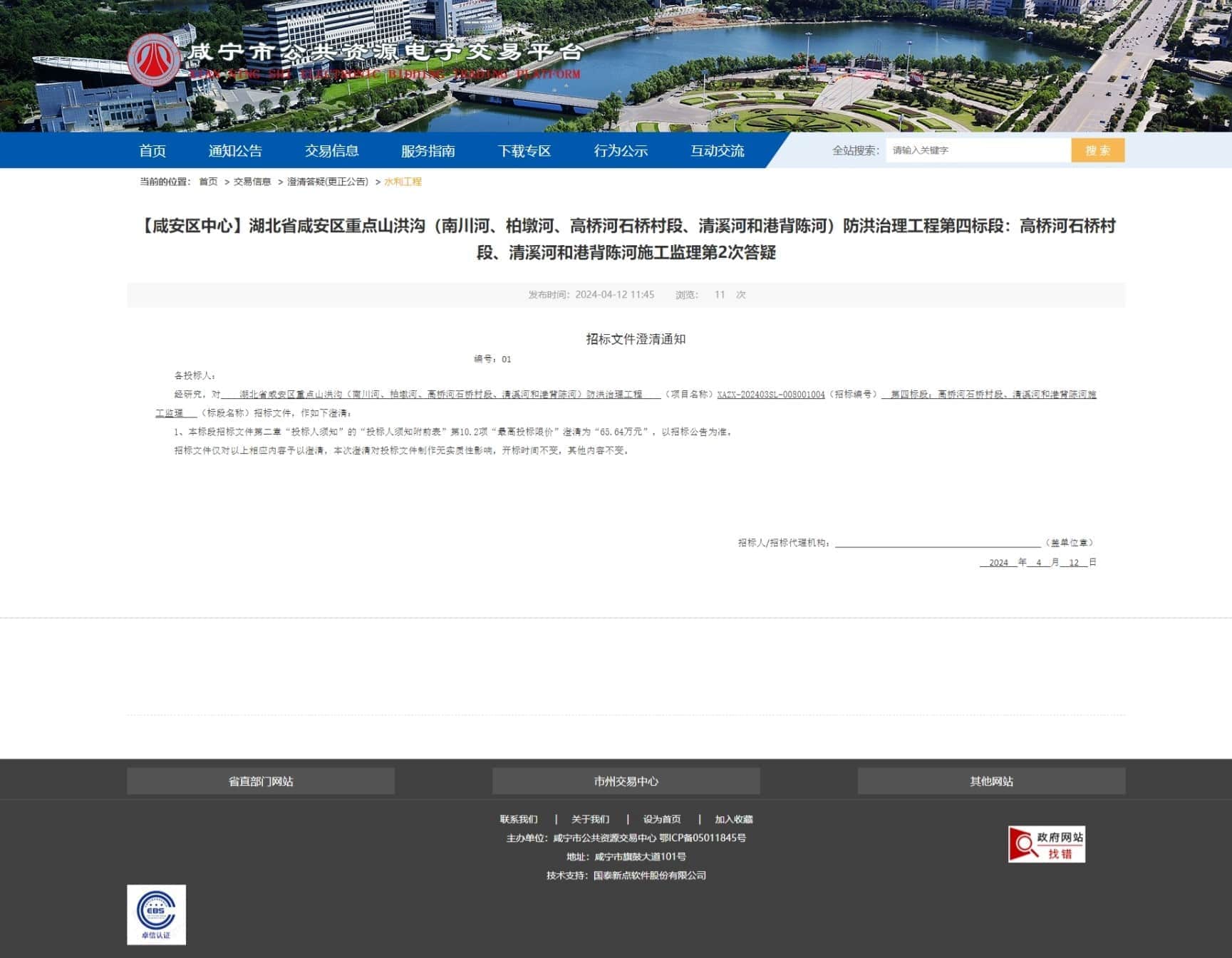 经研究,对 湖北省咸安区重点山洪沟(南川河、柏墩河、高桥河石桥村段、清溪河和港背陈河)防洪治理工程 (项目名称)XAZX-202403SL-008001004(招标编号) 第四标段:高桥河石桥村段、清溪河和港背陈河施工监理 (标段名称)招标文件,作如下澄清: