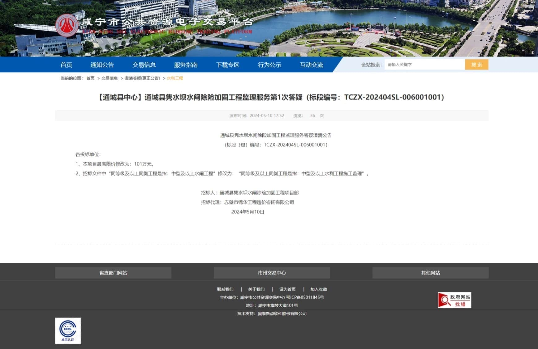 【通城县中心】通城县隽水坝水闸除险加固工程监理服务第1次答疑(标段编号:TCZX-202404SL-006001001)