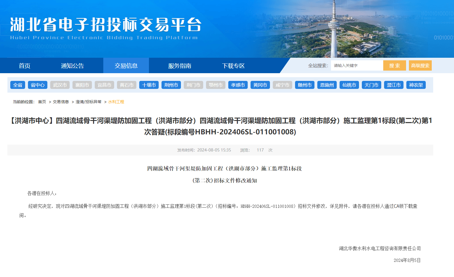 经研究决定,现对四湖流域骨干河渠堤防加固工程(洪湖市部分)施工监理第1标段(第二次)(招标编号:HBHH-202406SL-011001008)招标文件修改,详见附件,请各潜在投标人通过CA锁下载查阅。