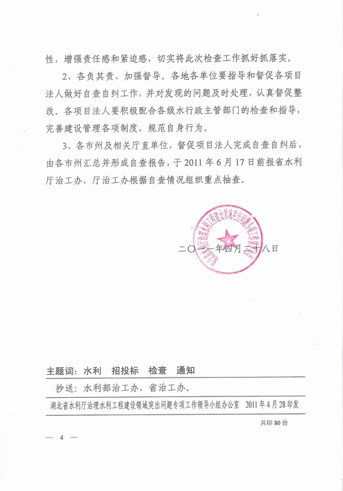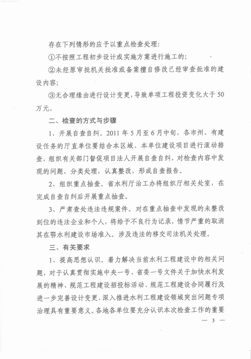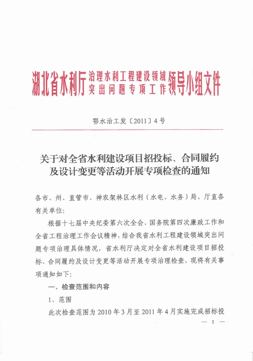 附件2:湖北省水利厅治理水利工程建设领域突出问题专项工作领导小组文件【鄂水治工发[2011]4号】《关于对全省水利建设项目招投标、合同履约及设计变更等活动开展专项检查的通知》