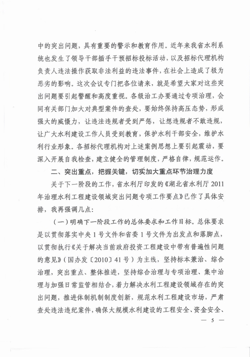 2011年4月29日上午9:00,在湖北省水利厅办公楼B座16楼会议室召开了《全省规范水利招投标市场暨水利工程建设领域突出问题整改督办工作会议》,参加会议的有:各市(州)水利(水电、水务)局分管招投标的副局长,治工办主任;汉江局、漳河、王英、高关、吴岭分管建设的副局长;在我省考核登记的各招标代理机构主要负责人;厅治工办各成员单位主要负责人,公司林总应邀请参加了本次会议。