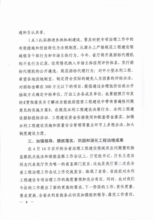 本次会议内容主要包括:传达中央、水利部、省专项治理工作会议精神;通报当前水利招投标市场存在的问题及典型案例;通报专项治理检查中发现的突出问题;安排部署下阶段工作,对招投标工作提出新的要求。