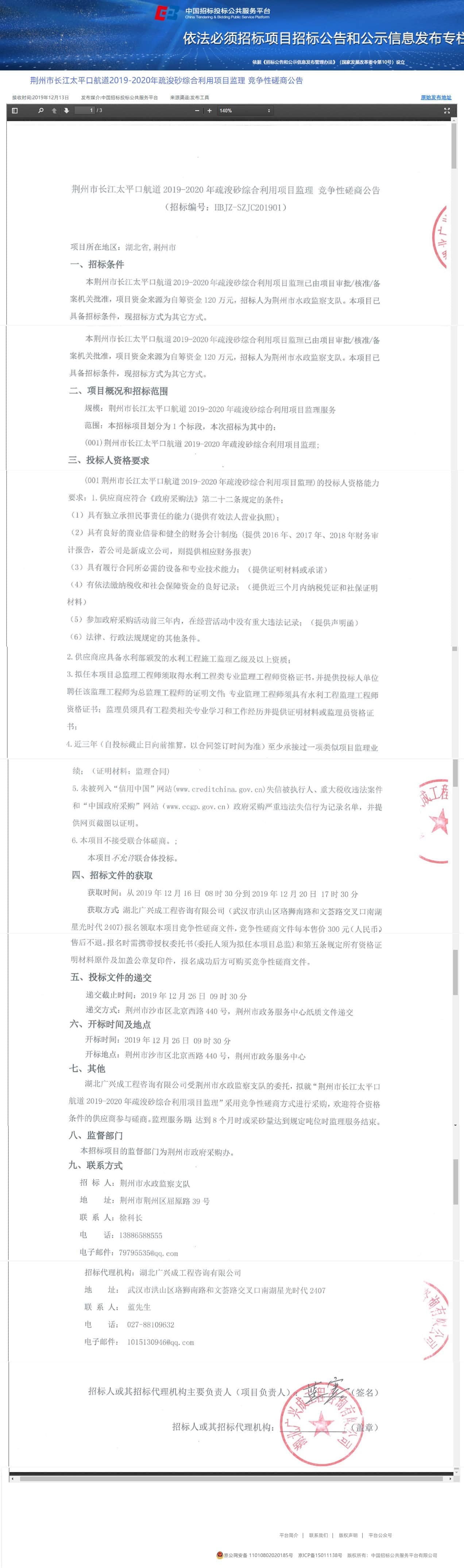 荆州市长江太平口航道2019-2020年疏浚砂综合利用项目监理 竞争性磋商公告