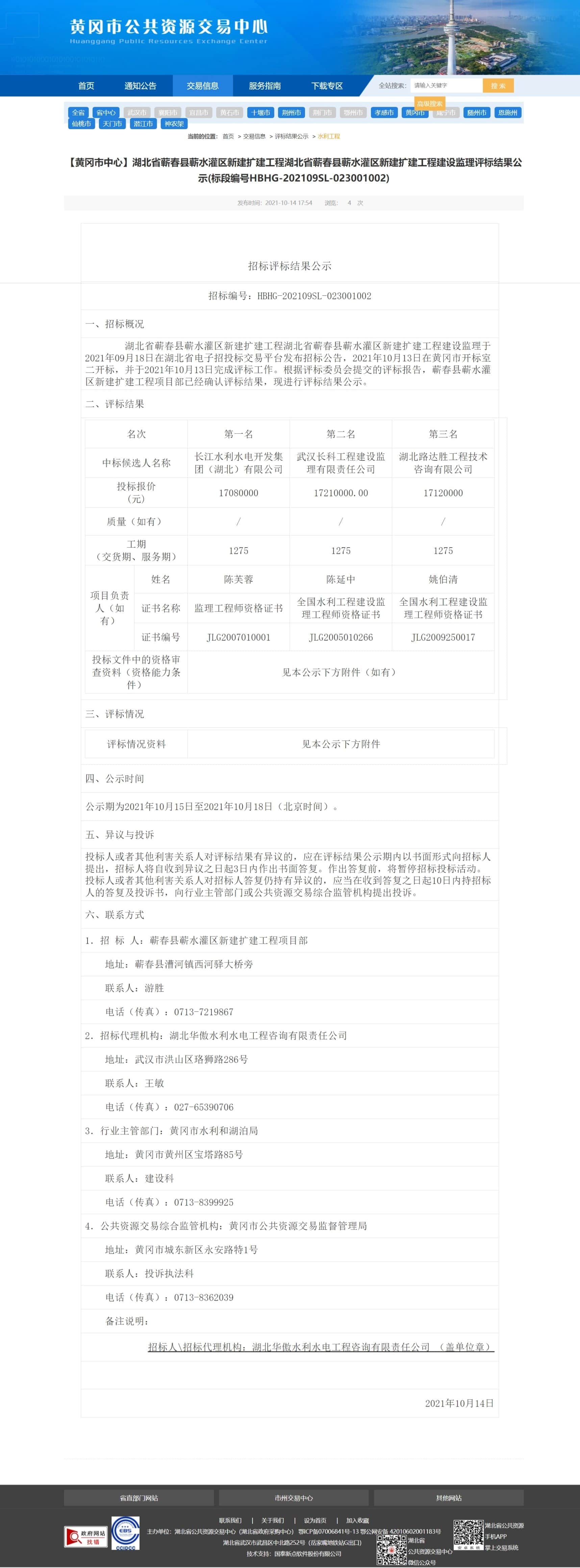 【黄冈市中心】湖北省蕲春县蕲水灌区新建扩建工程湖北省蕲春县蕲水灌区新建扩建工程建设监理评标结果公示(标段编号HBHG-202109SL-023001002)
