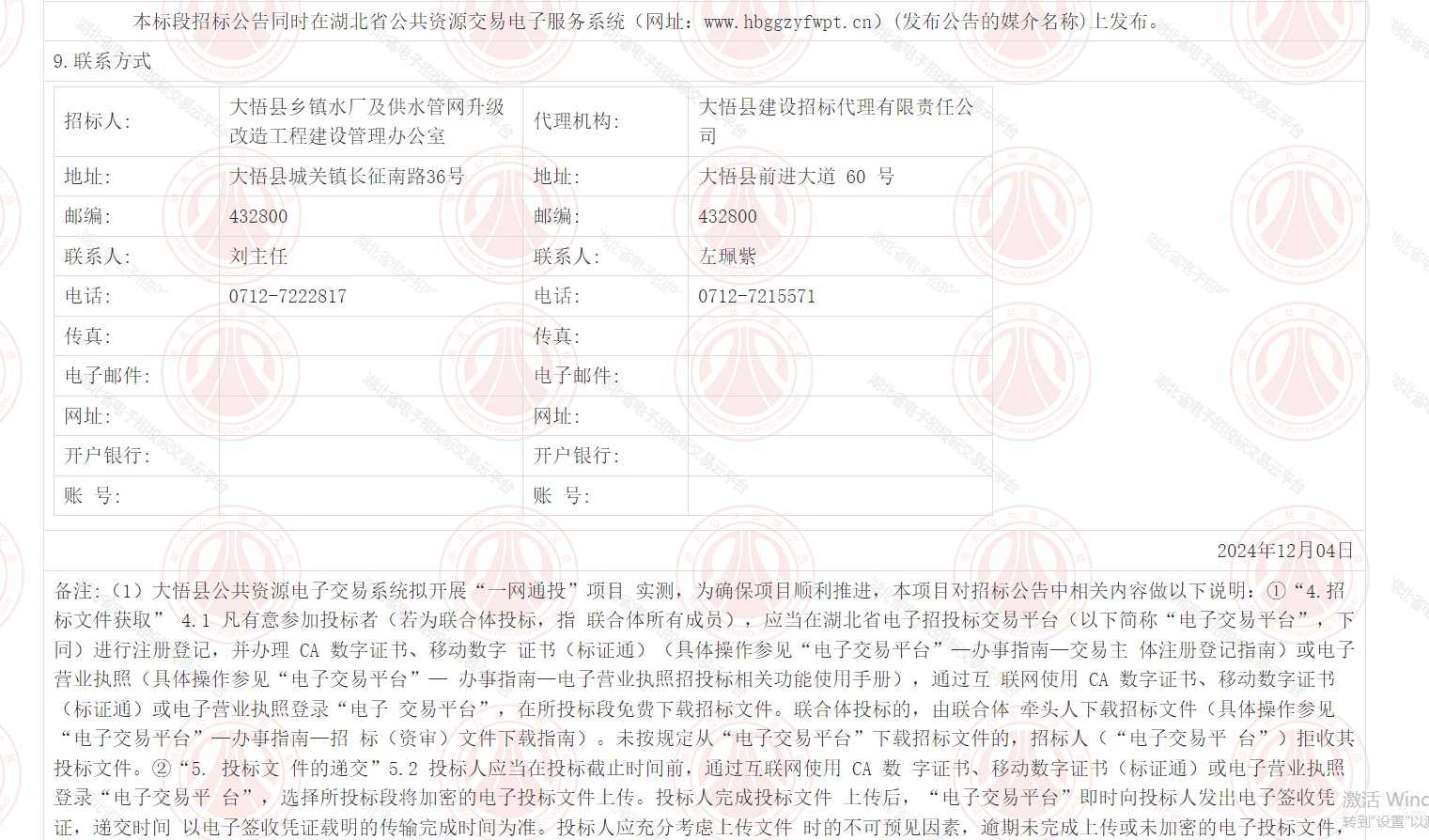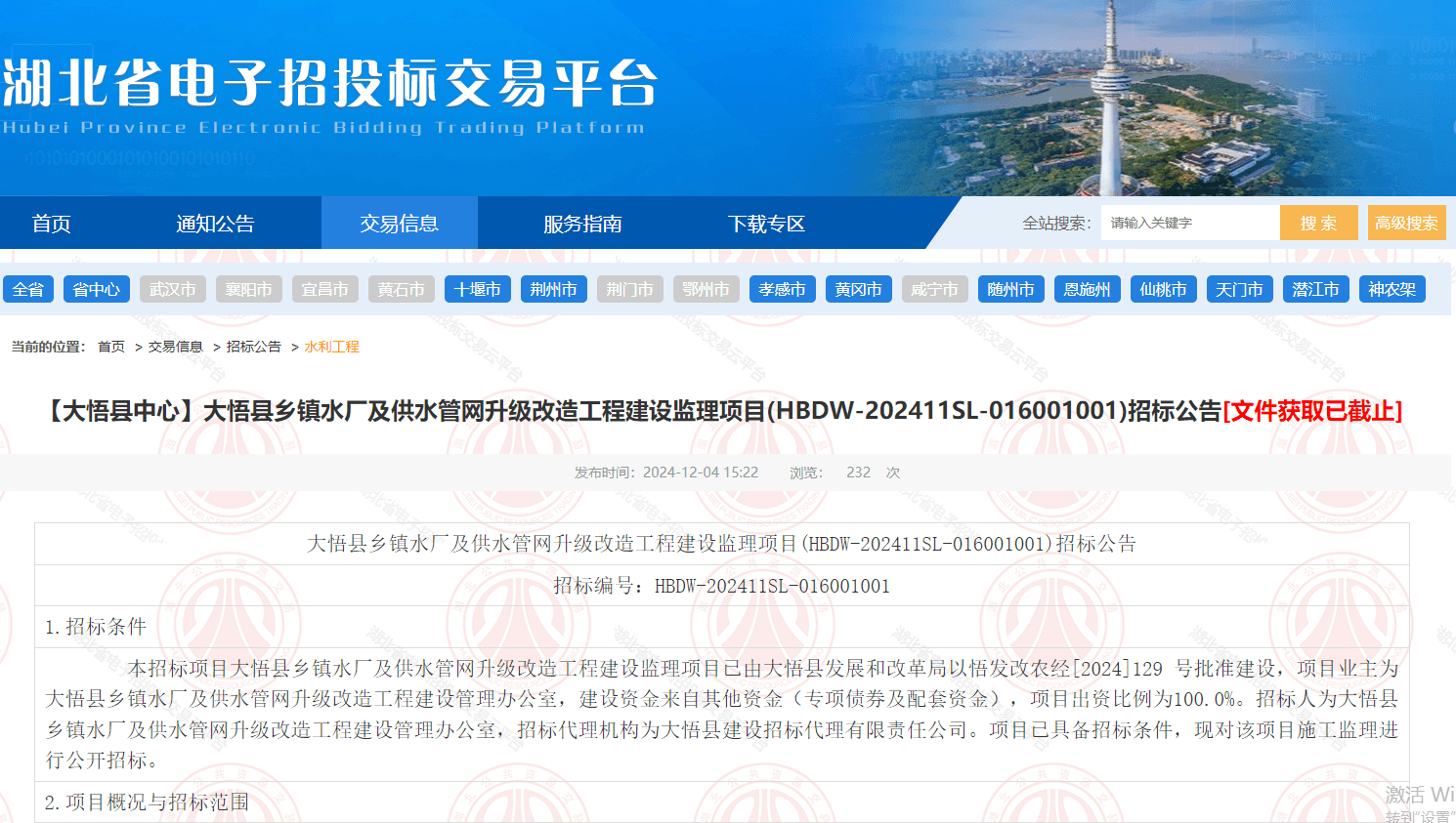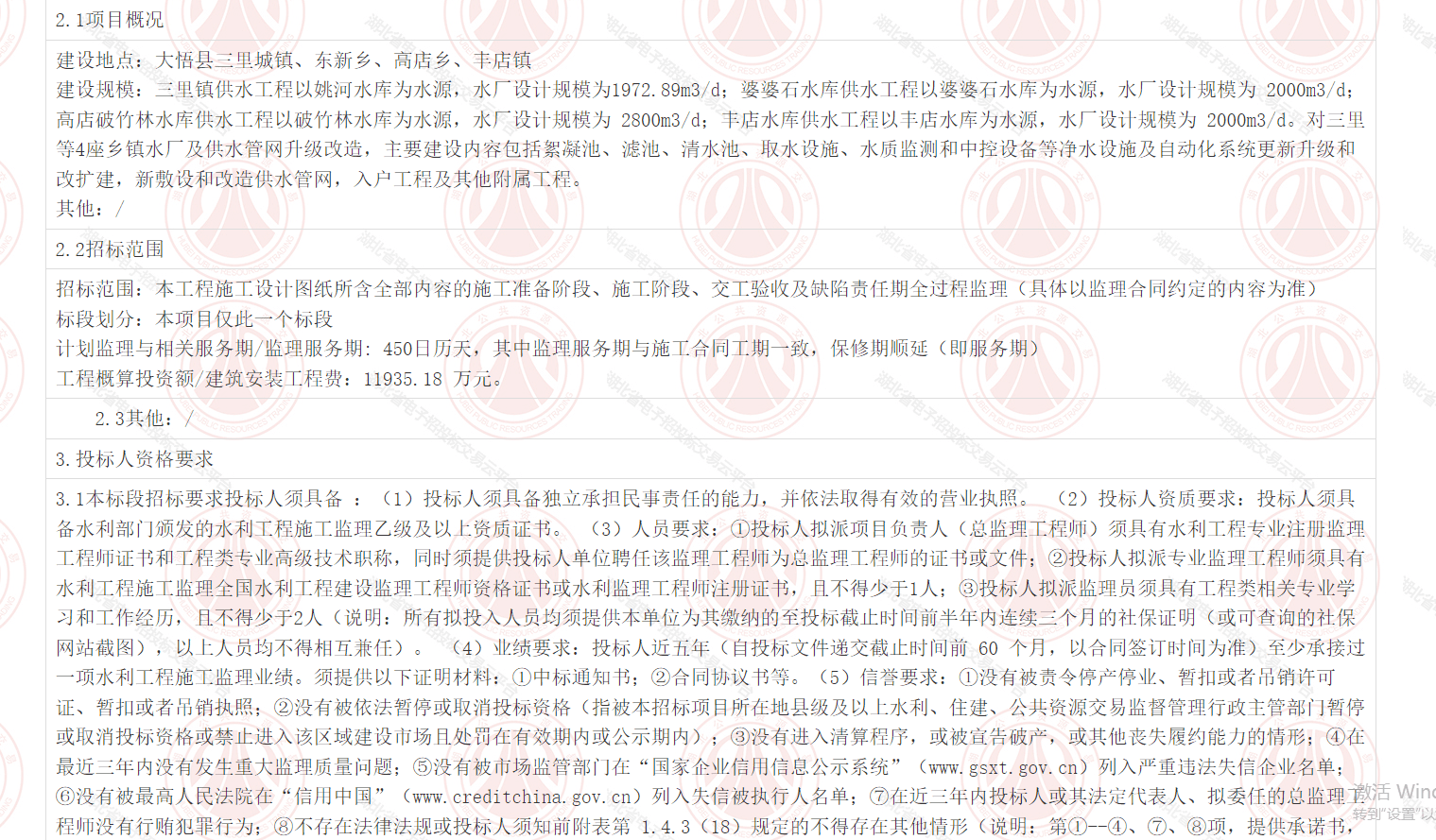 大悟县乡镇水厂及供水管网升级改造工程建设监理项目(HBDW-202411SL-016001001)招标公告