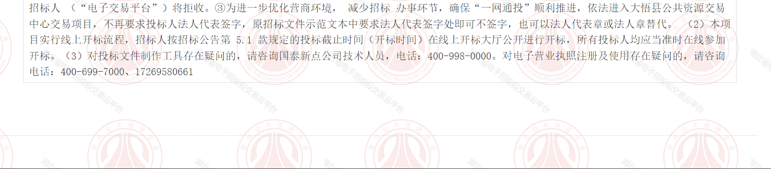 | 备注:(1)大悟县公共资源电子交易系统拟开展“一网通投”项目 实测,为确保项目顺利推进,本项目对招标公告中相关内容做以下说明:①“4.招标文件获取” 4.1 凡有意参加投标者(若为联合体投标,指 联合体所有成员),应当在湖北省电子招投标交易平台(以下简称“电子交易平台”,下同)进行注册登记,并办理 CA 数字证书、移动数字 证书(标证通)(具体操作参见“电子交易平台”—办事指南—交易主 体注册登记指南)或电子营业执照(具体操作参见“电子交易平台”— 办事指南—电子营业执照招投标相关功能使用手册),通过互 联网使用 CA 数字证书、移动数字证书(标证通)或电子营业执照登录“电子 交易平台”,在所投标段免费下载招标文件。联合体投标的,由联合体 牵头人下载招标文件(具体操作参见“电子交易平台”—办事指南—招 标(资审)文件下载指南)。未按规定从“电子交易平台”下载招标文件的,招标人(“电子交易平 台”)拒收其投标文件。②“5. 投标文 件的递交”5.2 投标人应当在投标截止时间前,通过互联网使用 CA 数 字证书、移动数字证书(标证通)或电子营业执照登录“电子交易平 台”,选择所投标段将加密的电子投标文件上传。投标人完成投标文件 上传后,“电子交易平台”即时向投标人发出电子签收凭证,递交时间 以电子签收凭证载明的传输完成时间为准。投标人应充分考虑上传文件 时的不可预见因素,逾期未完成上传或未加密的电子投标文件,招标人 (“电子交易平台”)将拒收。③为进一步优化营商环境, 减少招标 办事环节,确保“一网通投”顺利推进,依法进入大悟县公共资源交易中心交易项目,不再要求投标人法人代表签字,原招标文件示范文本中要求法人代表签字处即可不签字,也可以法人代表章或法人章替代。 (2)本项目实行线上开标流程,招标人按招标公告第 5.1 款规定的投标截止时间(开标时间)在线上开标大厅公开进行开标,所有投标人均应当准时在线参加开标。(3)对投标文件制作工具存在疑问的,请咨询国泰新点公司技术人员,电话:400-998-0000。对电子营业执照注册及使用存在疑问的,请咨询电话:400-699-7000、17269580661 |