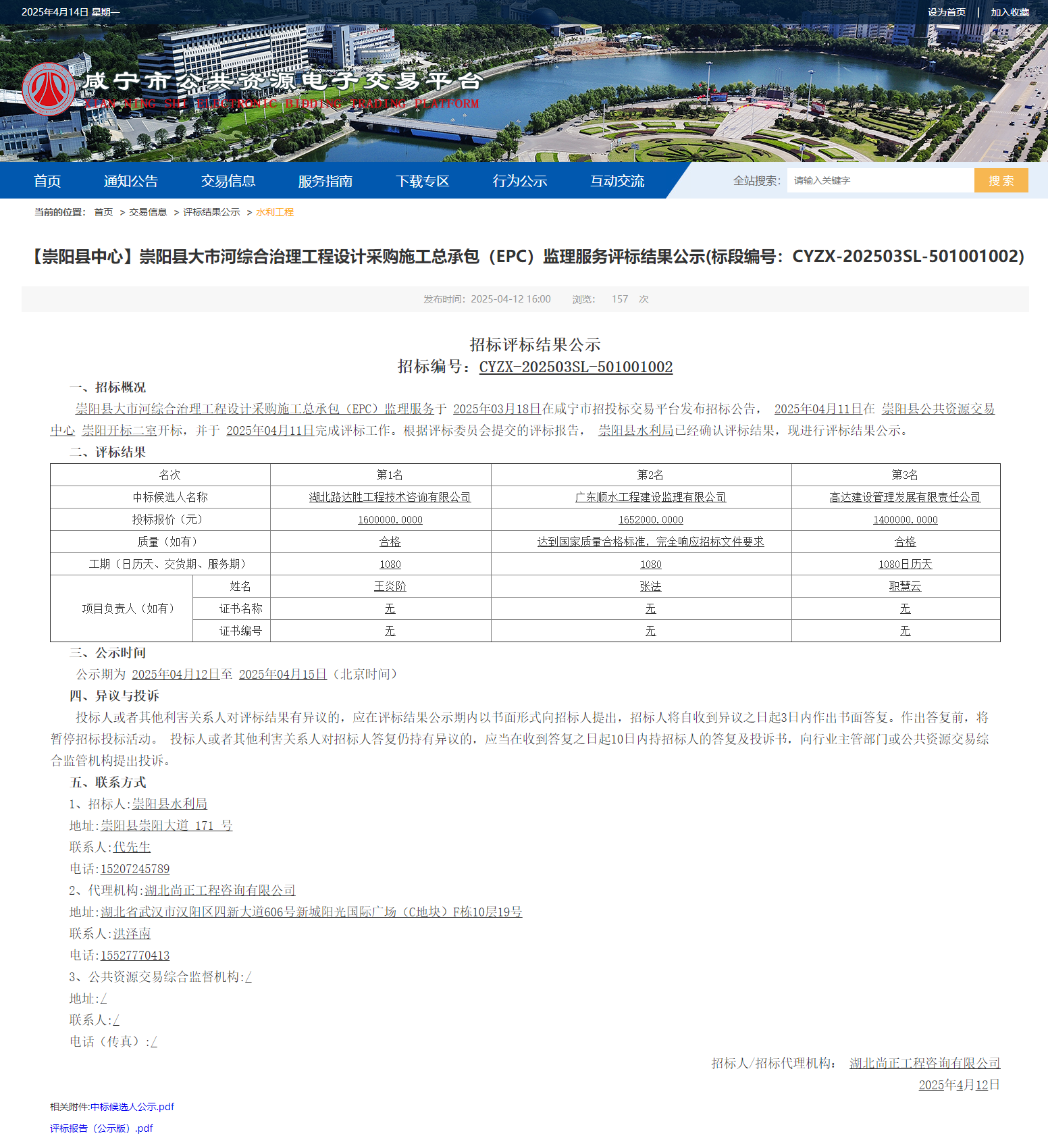 崇阳县大市河综合治理工程设计采购施工总承包(EPC)监理服务于 2025年03月18日在咸宁市招投标交易平台发布招标公告, 2025年04月11日在 崇阳县公共资源交易中心 崇阳开标二室开标,并于 2025年04月11日完成评标工作。根据评标委员会提交的评标报告, 崇阳县水利局已经确认评标结果,现进行评标结果公示。