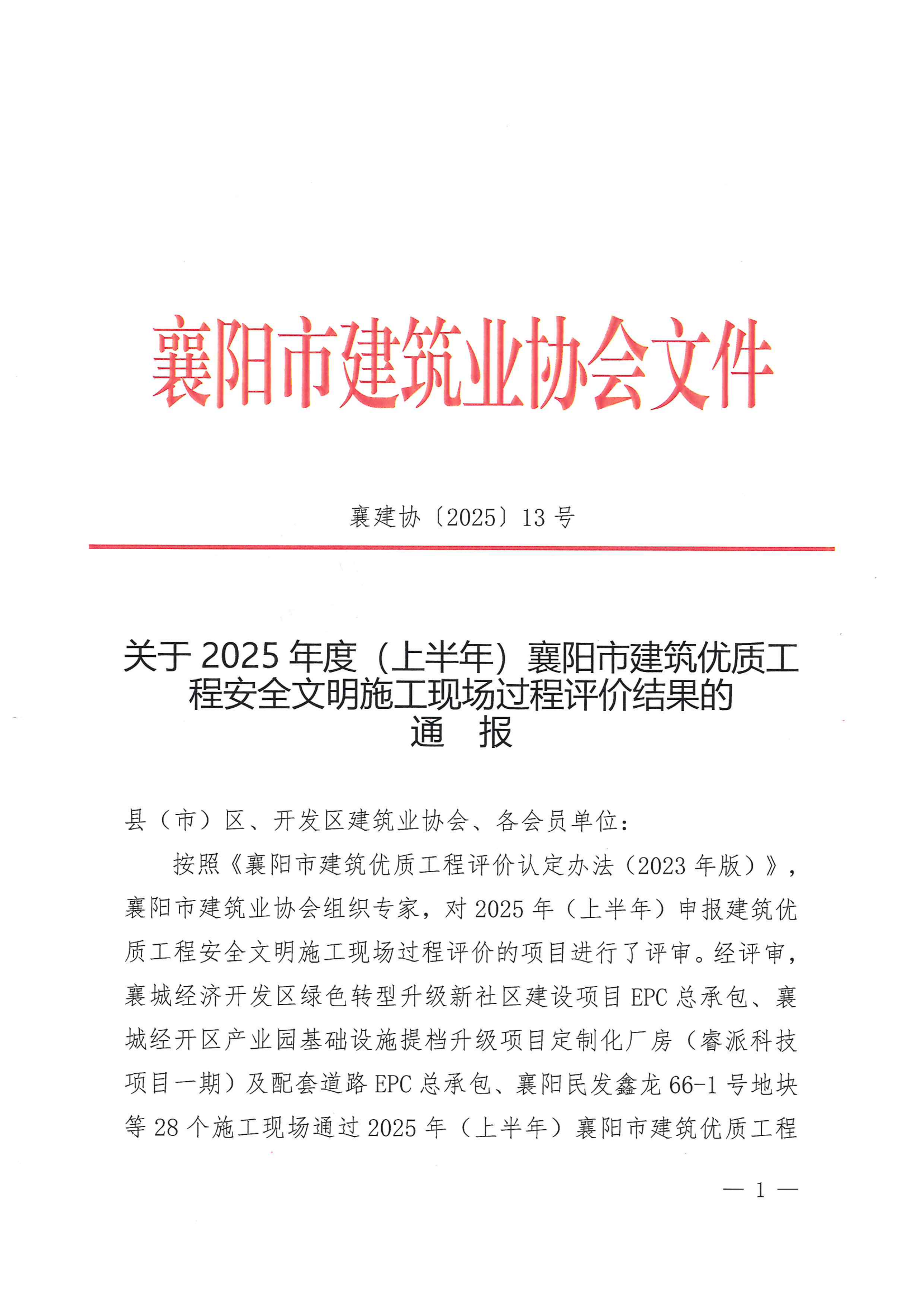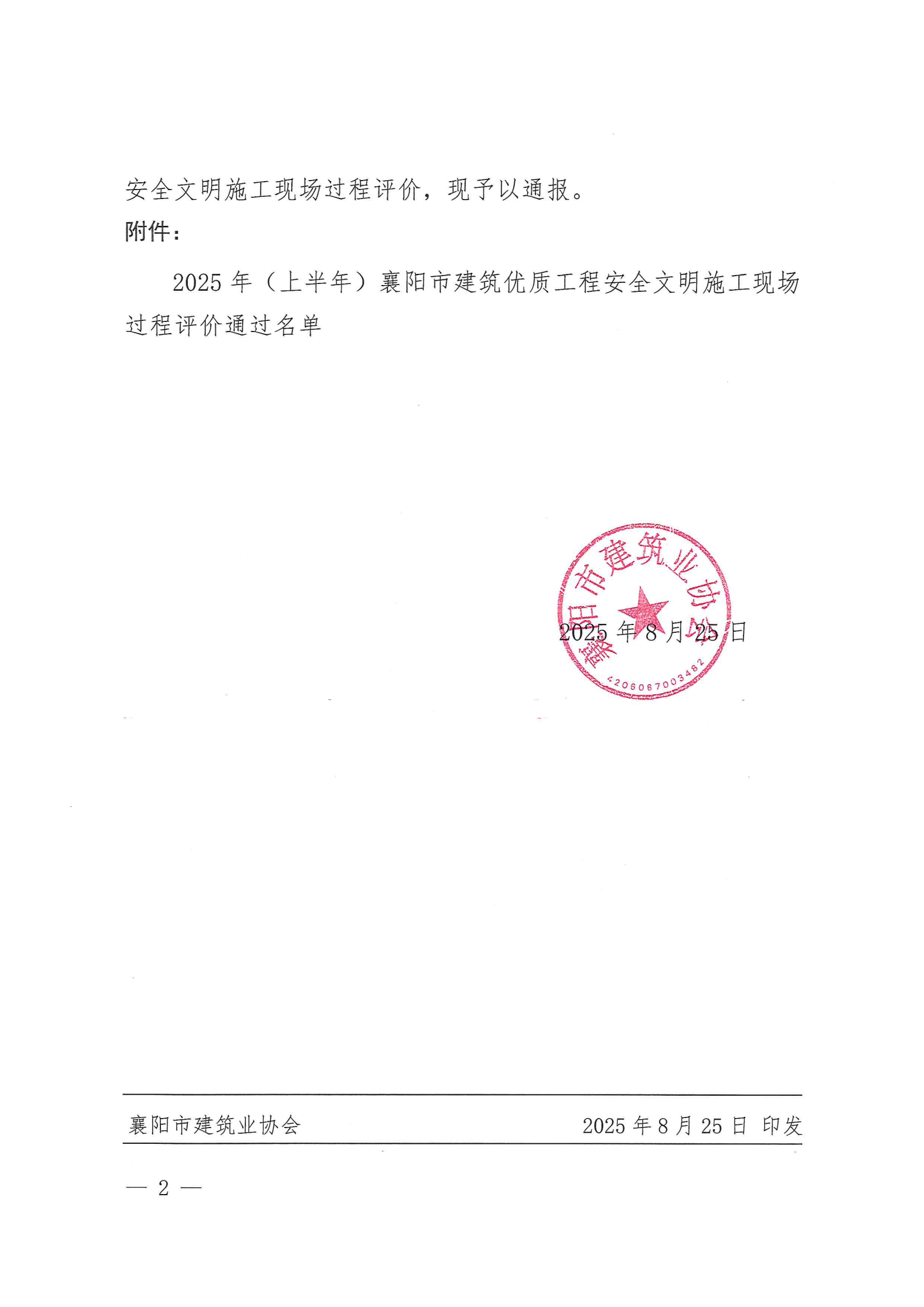 关于2025年度(上半年)襄阳市建筑优质工程安全文明施工现场过程评价结果的通报
