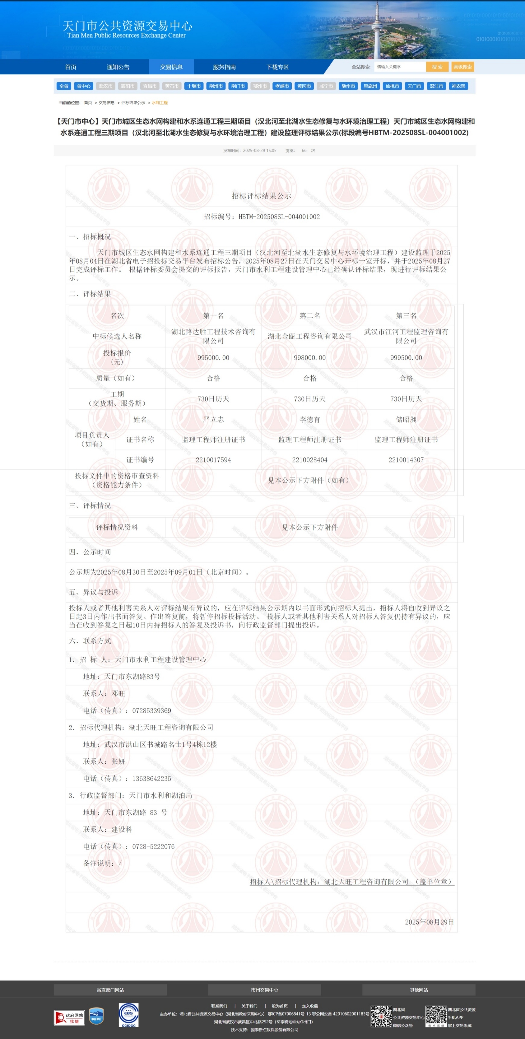 天门市城区生态水网构建和水系连通工程三期项目(汉北河至北湖水生态修复与水环境治理工程)建设监理于2025年08月04日在湖北省电子招投标交易平台发布招标公告,2025年08月27日在天门交易中心开标一室开标,并于2025年08月27日完成评标工作。 根据评标委员会提交的评标报告,天门市水利工程建设管理中心已经确认评标结果,现进行评标结果公示。