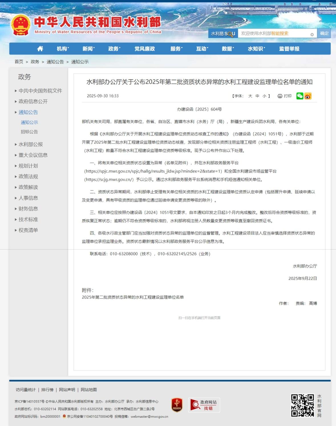 水利部办公厅关于公布2025年第二批资质状态异常的水利工程建设监理单位名单的通知