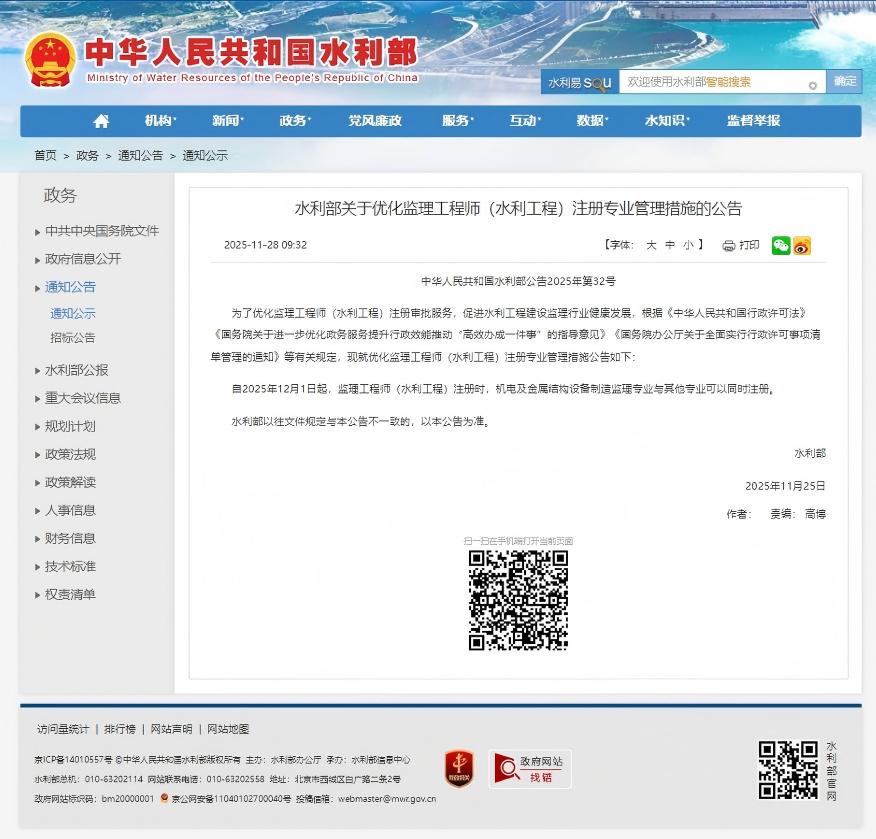 水利部关于优化监理工程师(水利工程)注册专业管理措施的公告