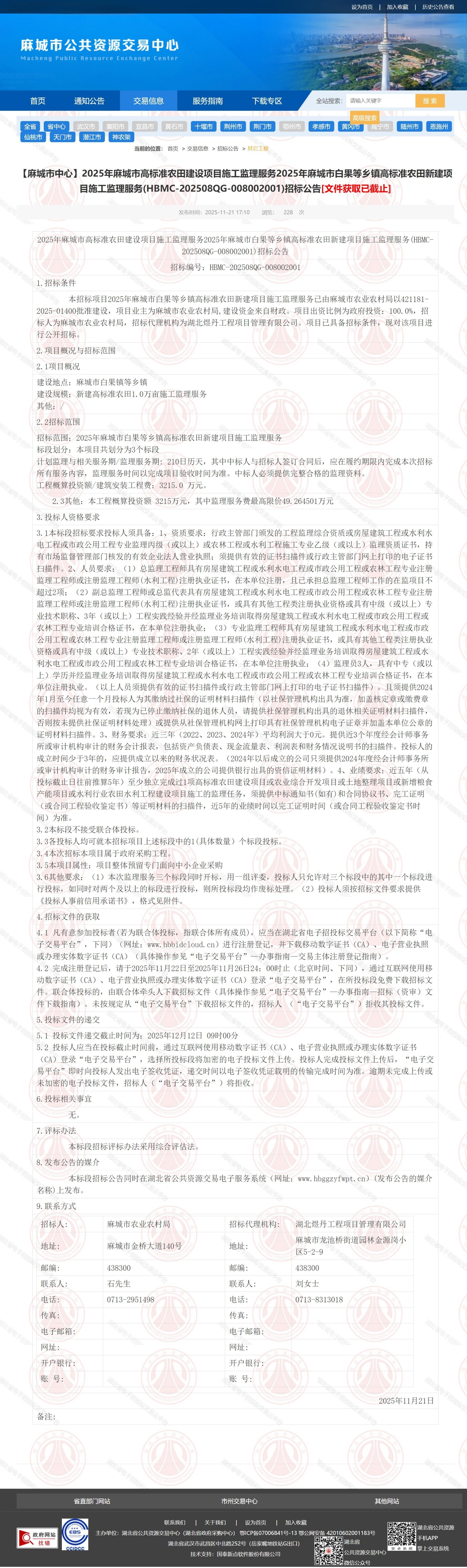 2025年麻城市白果等乡镇高标准农田新建项目施工监理服务招标公告