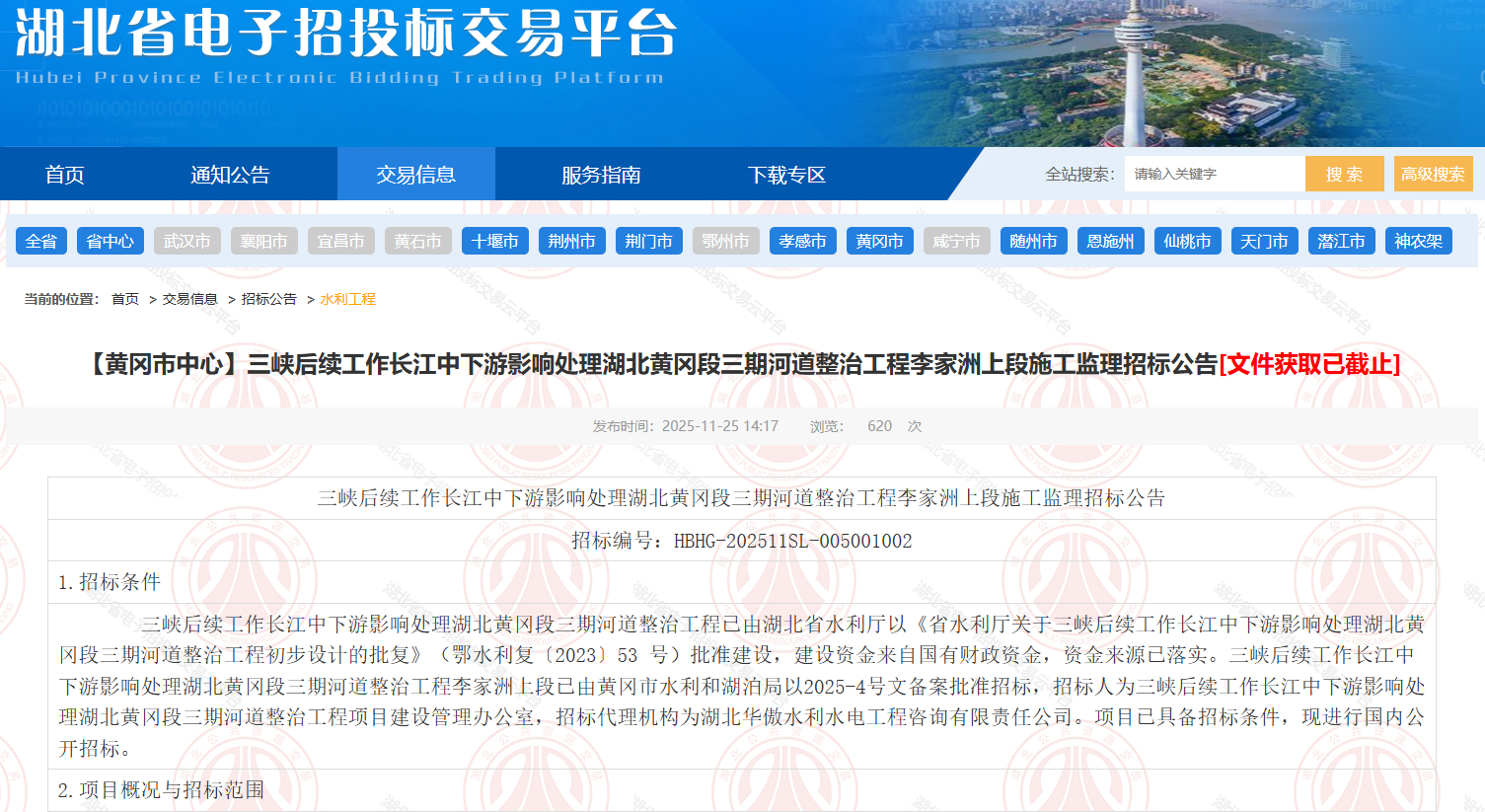 2.3其他:本次招标共划分为2个标段。施工标段合同名称为:三峡后续工作长江中下游影响处理湖北黄冈段三期河道整治工程李家洲上段施工(合同编号:HG/SXHX/HDZZ/2025-SG1)。监理标段合同名称为:三峡后续工作长江中下游影响处理湖北黄冈段三期河道整治工程李家洲上段施工监理(合同编号:HG/SXHX/HDZZ/2025-JL1)。