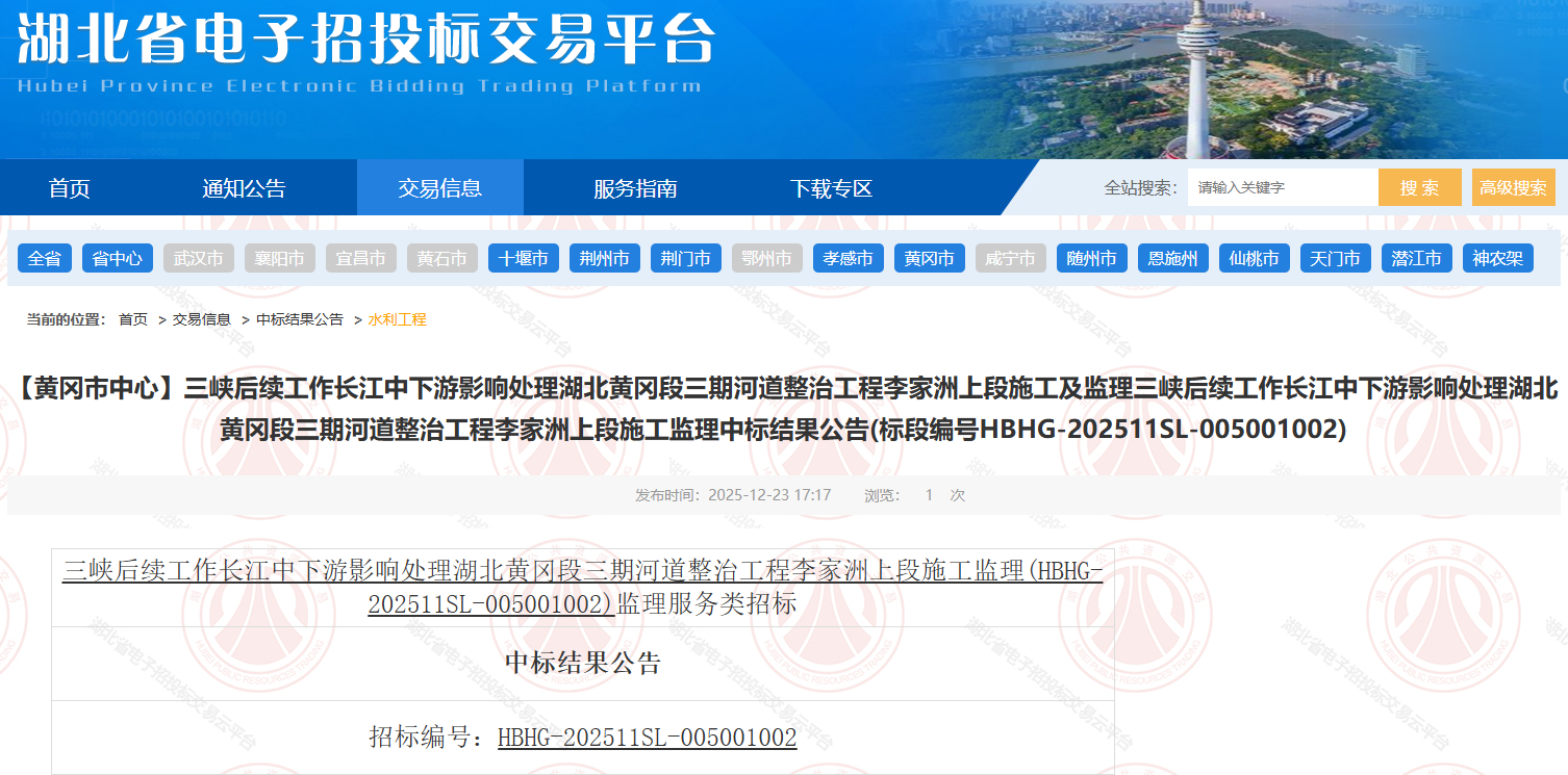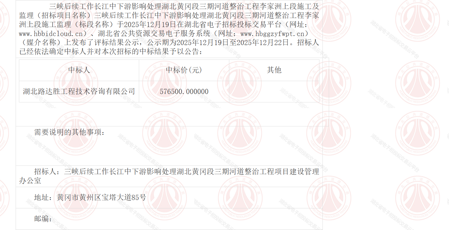 三峡后续工作长江中下游影响处理湖北黄冈段三期河道整治工程李家洲上段施工及监理(招标项目名称)三峡后续工作长江中下游影响处理湖北黄冈段三期河道整治工程李家洲上段施工监理(标段名称)于2025年12月19日在湖北省电子招标投标交易平台(网址:www.hbbidcloud.cn)、湖北省公共资源交易电子服务系统(网址:www.hbggzyfwpt.cn)(媒介名称)上发布了评标结果公示,公示期为2025年12月19日至2025年12月22日。招标人已经依法确定中标人并对本次招标的中标结果予以公告: