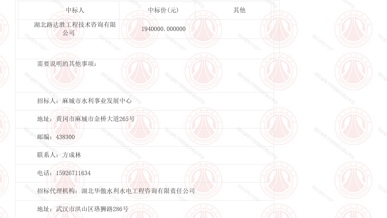 湖北省麻城市浮桥河水库引调水工程(招标项目名称)湖北省麻城市浮桥河水库引调水工程施工监理(标段名称)于2026年04月04日在湖北省电子招标投标交易平台(网址:www.hbbidcloud.cn)、湖北省公共资源交易电子服务系统(网址:www.hbggzyfwpt.cn)(媒介名称)上发布了评标结果公示,公示期为2026年04月04日至2026年04月07日。招标人已经依法确定中标人并对本次招标的中标结果予以公告: