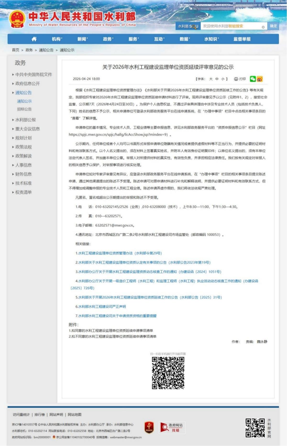 根据《水利工程建设监理单位资质管理办法》《水利部关于开展2026年水利工程建设监理单位资质延续工作的公告》等有关规定,我部组织专家对2026年水利工程建设监理单位资质延续申请材料进行了评审。现将评审意见予以公示(见附件1、2),接受社会监督,公示期7天(2026年4月24日至30日)。为保护个人信息权益,不通过评审具体理由中涉及专业技术人员(包括技术负责人,下同)姓名的信息不予公示,相关申请单位可登录水利部政务服务平台在线申请系统,在“办理中事项”栏目中点击相关事项条目的“查看”了解详情。