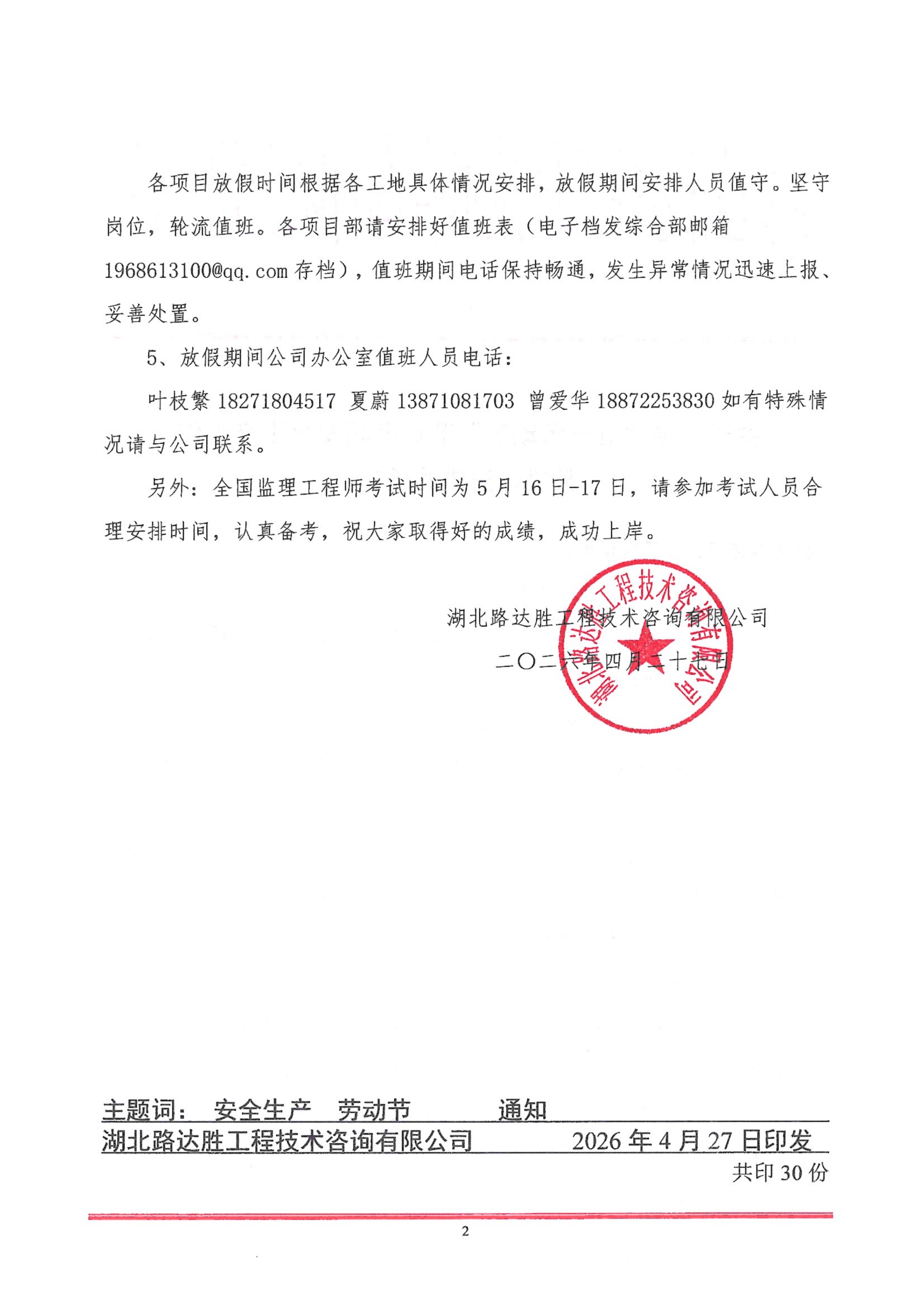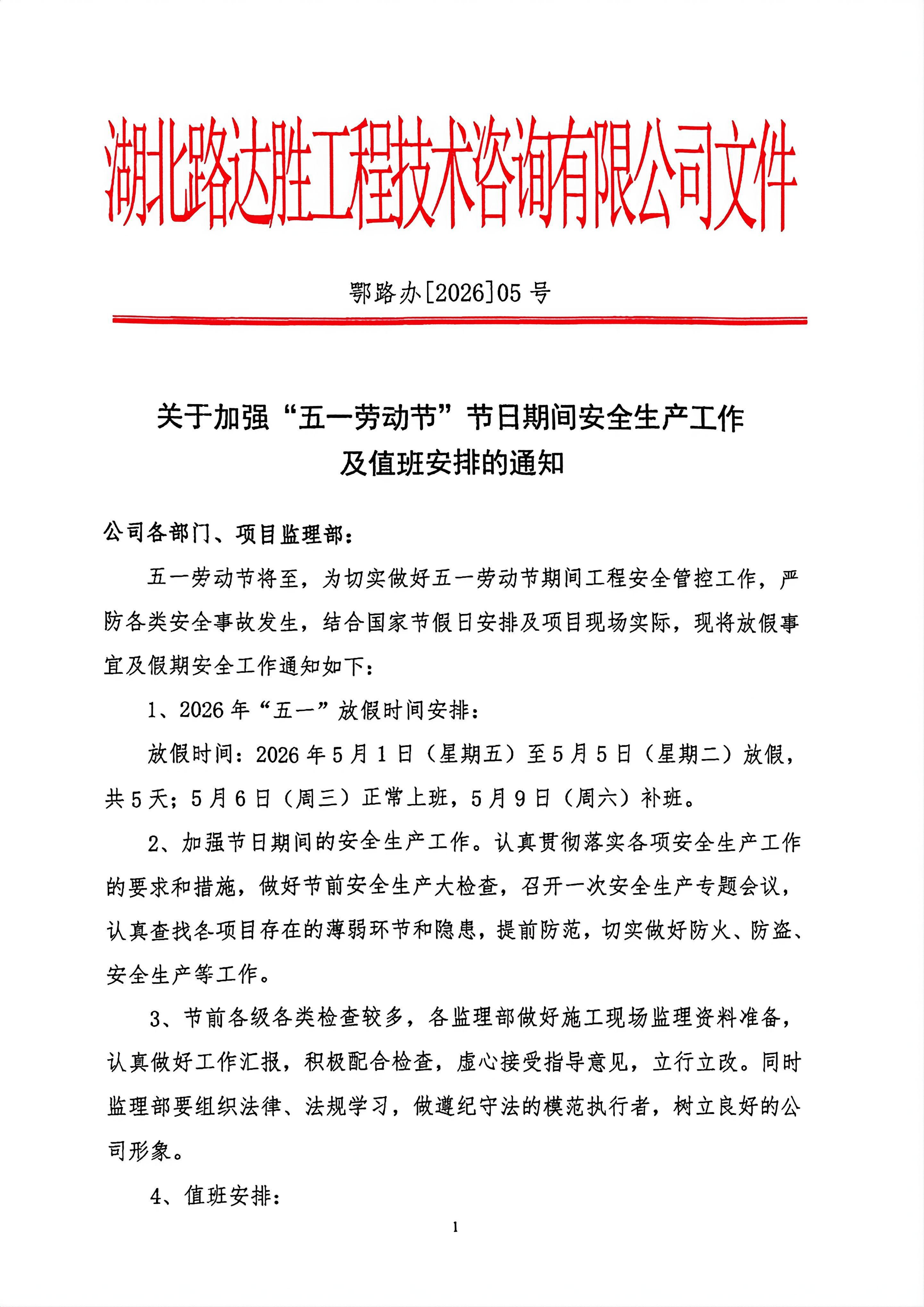 关于加强“五一劳动节”节日期间安全生产工作及值班安排的通知